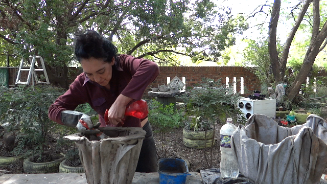 I use the soil from Zohey’s garden, where she use to run, play, poop and piddle mix it with cement to create concrete and call it concrete love, then I take one of her old throws, cut it in to smaller pieces, dip it into this mixture of love, and drape it in to a pot of love.