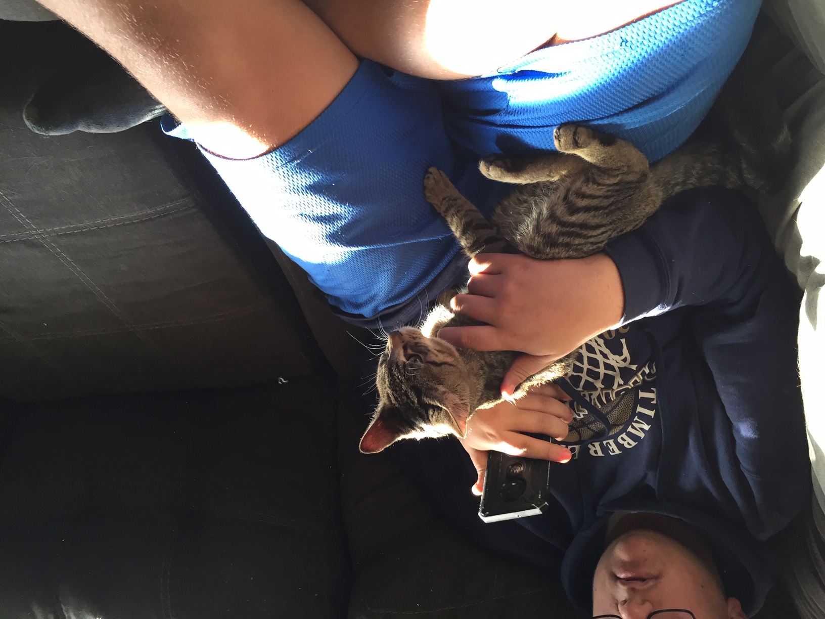 Over the last few months I have had SEVEN female kittens foisted on us. People think that just because I have a farm I must need cats on every square inch of it or something. A couple of days ago we walked outside and there was a little tabby kitten just sitting on our apple press. Someone had dumped her. You could tell she had been someone's indoor pet, as the creature did not have an outdoor level of fur growth and loved dogs. She's also trained to be an indoor and outdoor cat, so LT (Lizard Two as she is pretty much a clone of cat Elizabeth, AKA: The Lizard) gets to hang out with us at the house instead of being assimilated into the barn cat population. Yes, we are suckers.
