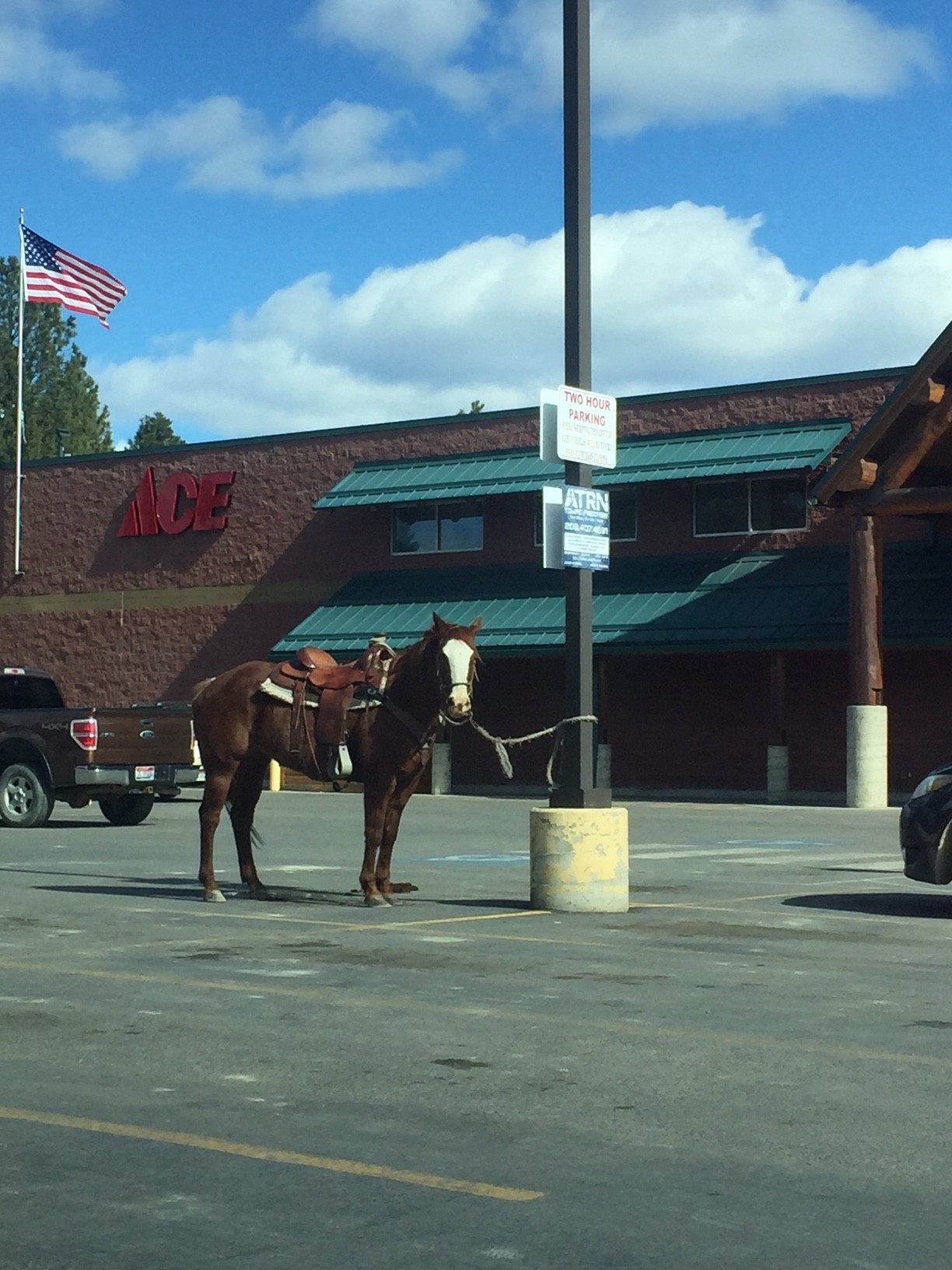 This is not a safe scene. My husband and I pulled into the gas station that adjoins our local grocery store and my animal radar immediately picked up on this creature. Animals in distress is one of the worst things ever, and this poor soul was in full nervous mode. Now, I love to see people riding their horses into town, it always tickles me, and in fact, I spent several years on my Sister-In-Law's ranch doing guided trail rides through the woods and into town. You know one thing we never did? Tie up a horse, alone, in the middle of a very busy parking lot. That poor creature was exhibiting all signs of horsey distress and with his 4 feet of slack he was spinning around that pole every so often into four separate parking spaces. So many bad things could have occurred and my mouth just hung open in awe at the ludicrousness of the situation. People. Sigh.