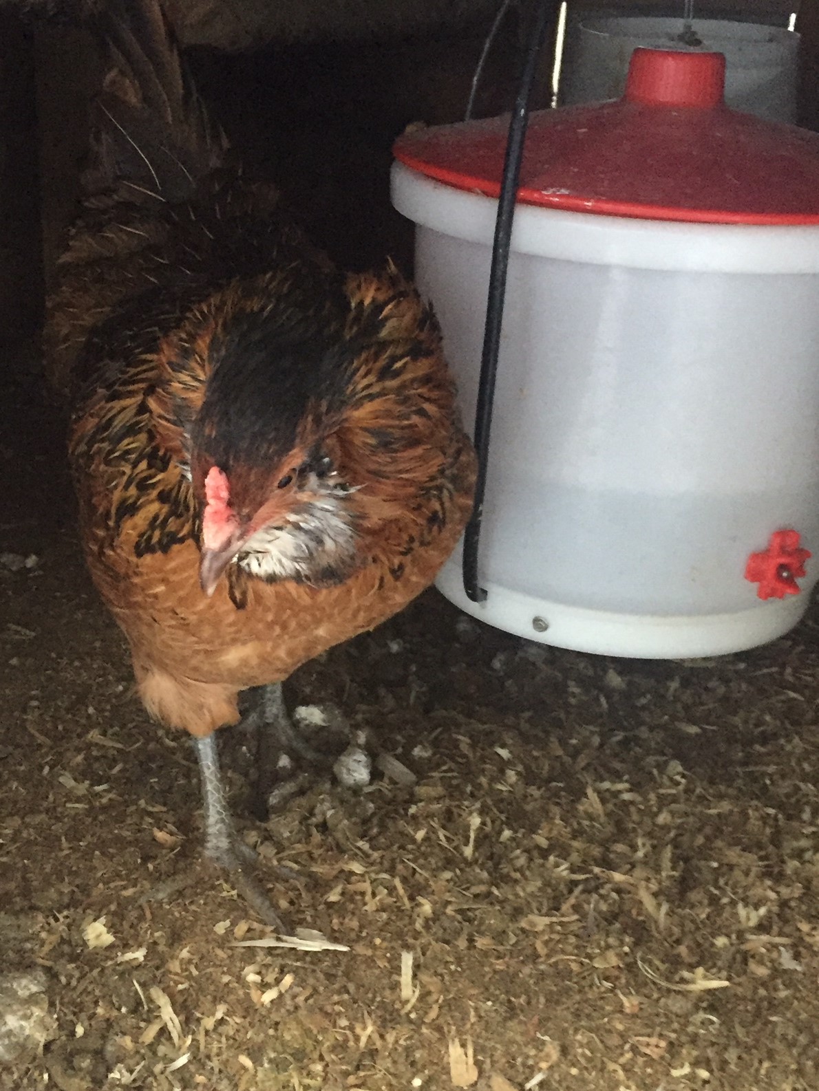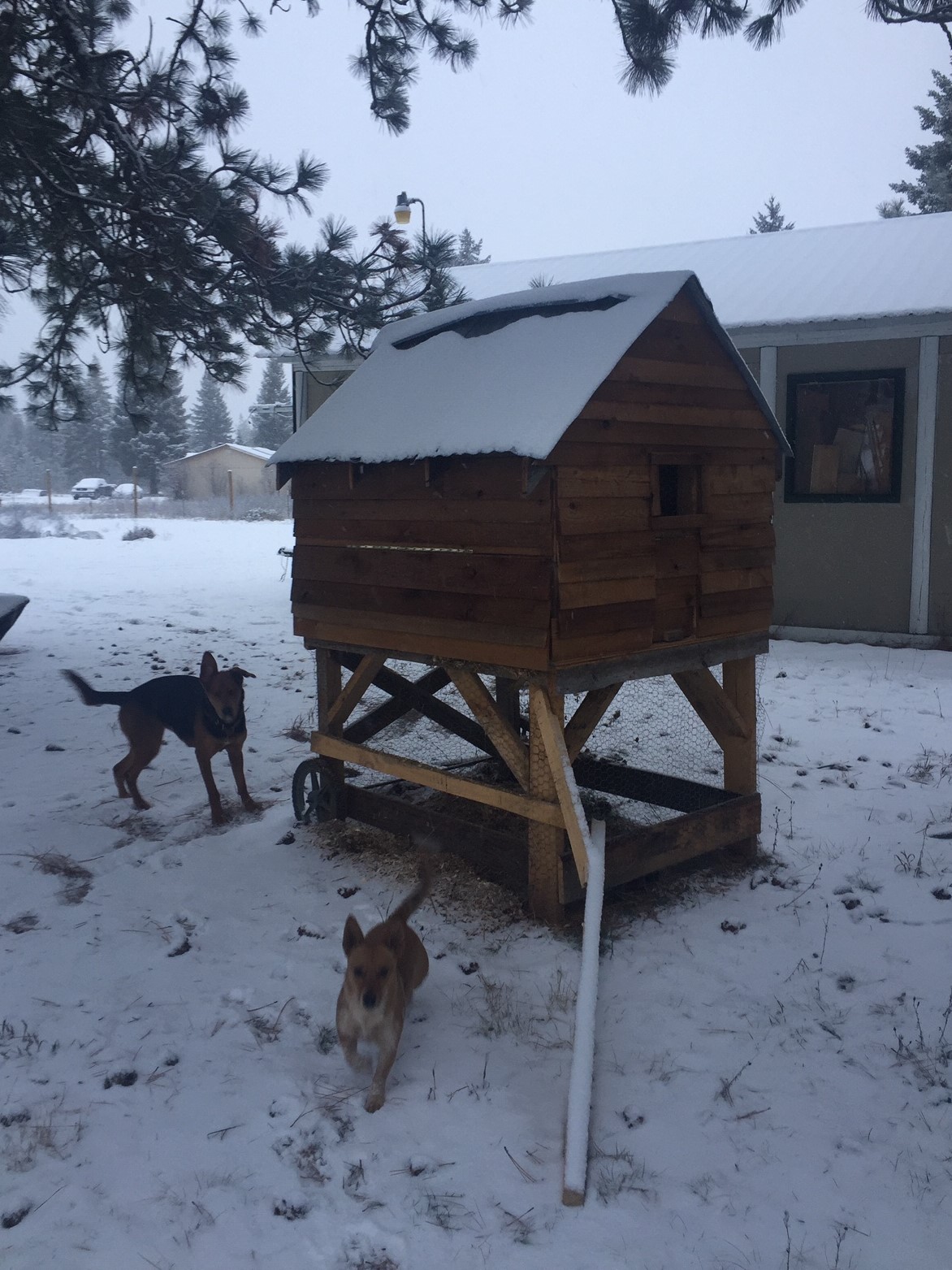 The last stop on my chore trail is the chickens. My hubs constructed the most excellent little hen house using materials we had laying around the farm. It also has an attachable big yard for when the weather is nicer. Most of the time my girls won't even come down their gang plank to the little yard under their house until spring. It's probably because some weirdo human supplies them with everything they could possible want, heated water, fresh greens, grit, shavings, lighting, food, etc...Spoiled beasties.