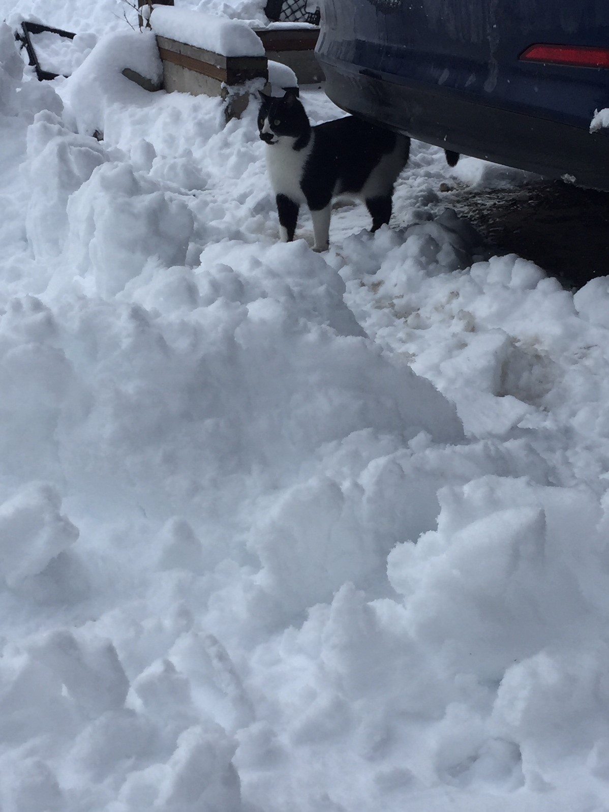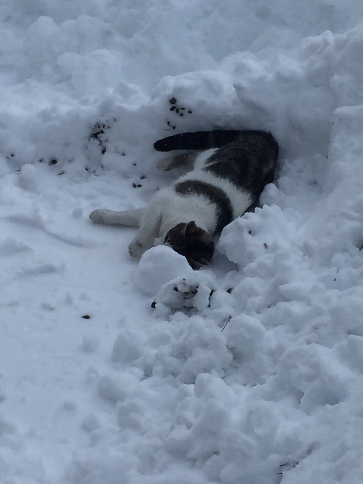 Wow, that's a lot of white stuff. But I'm glad you are being a lame adult in the midst of it all. I got a good number of chortles out of this post (what else is new), and your kitty is a bit of a nut, too. I agree, "HMM??!" One never can tell about our dorky, four legged friends. Maybe it's flea abatement through freezing...