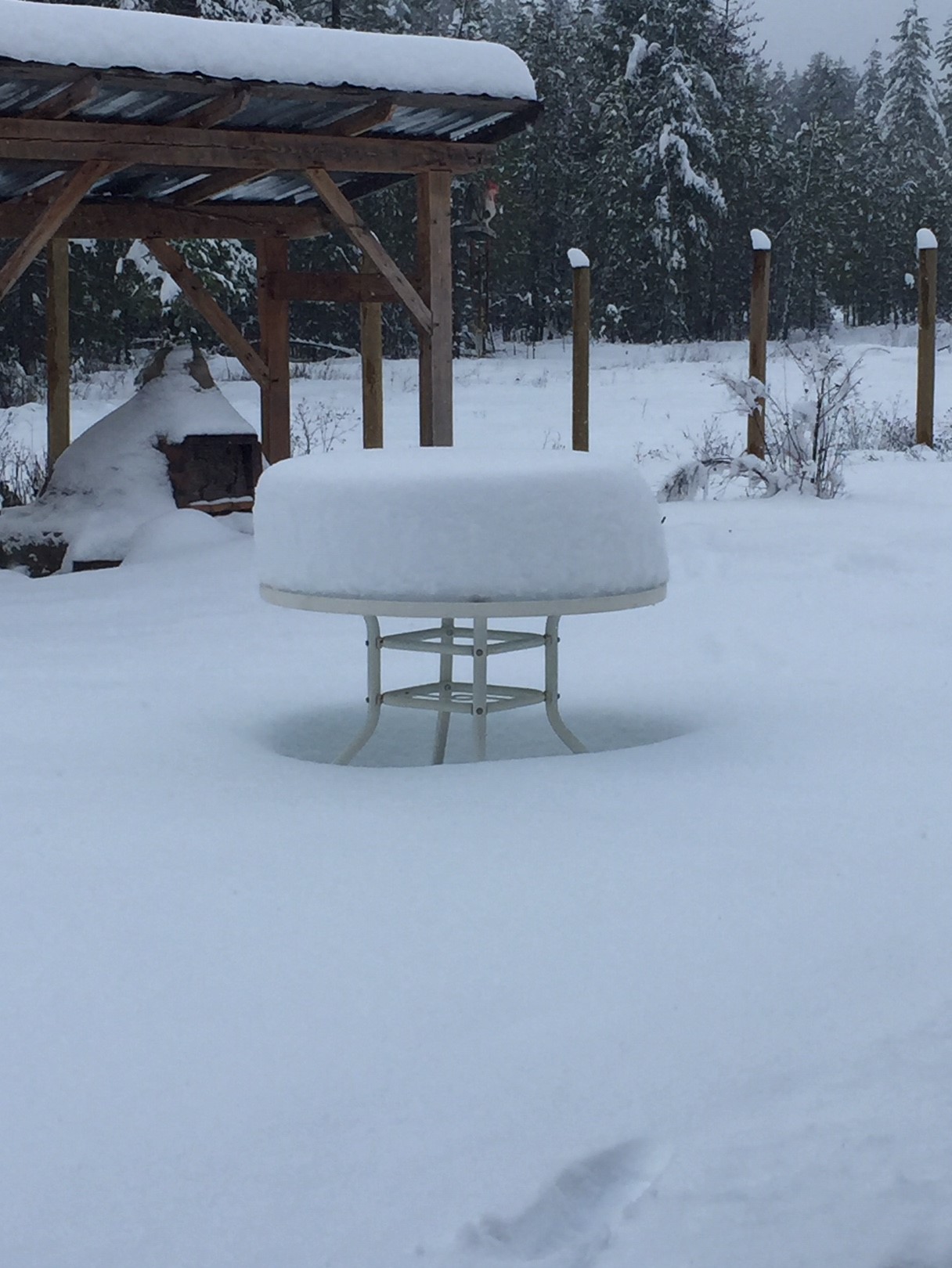 I love your table too, in no time, it will look like one giant marshmallow on a metal stand. Gotta love it. Well, keep trudgin, shovlin, feedin and keepin on. I don't miss that stuff, though it's supposed to snow here tonight. Not like a N. Idiho blow though. Yikes. Stay warm, and forever cool,