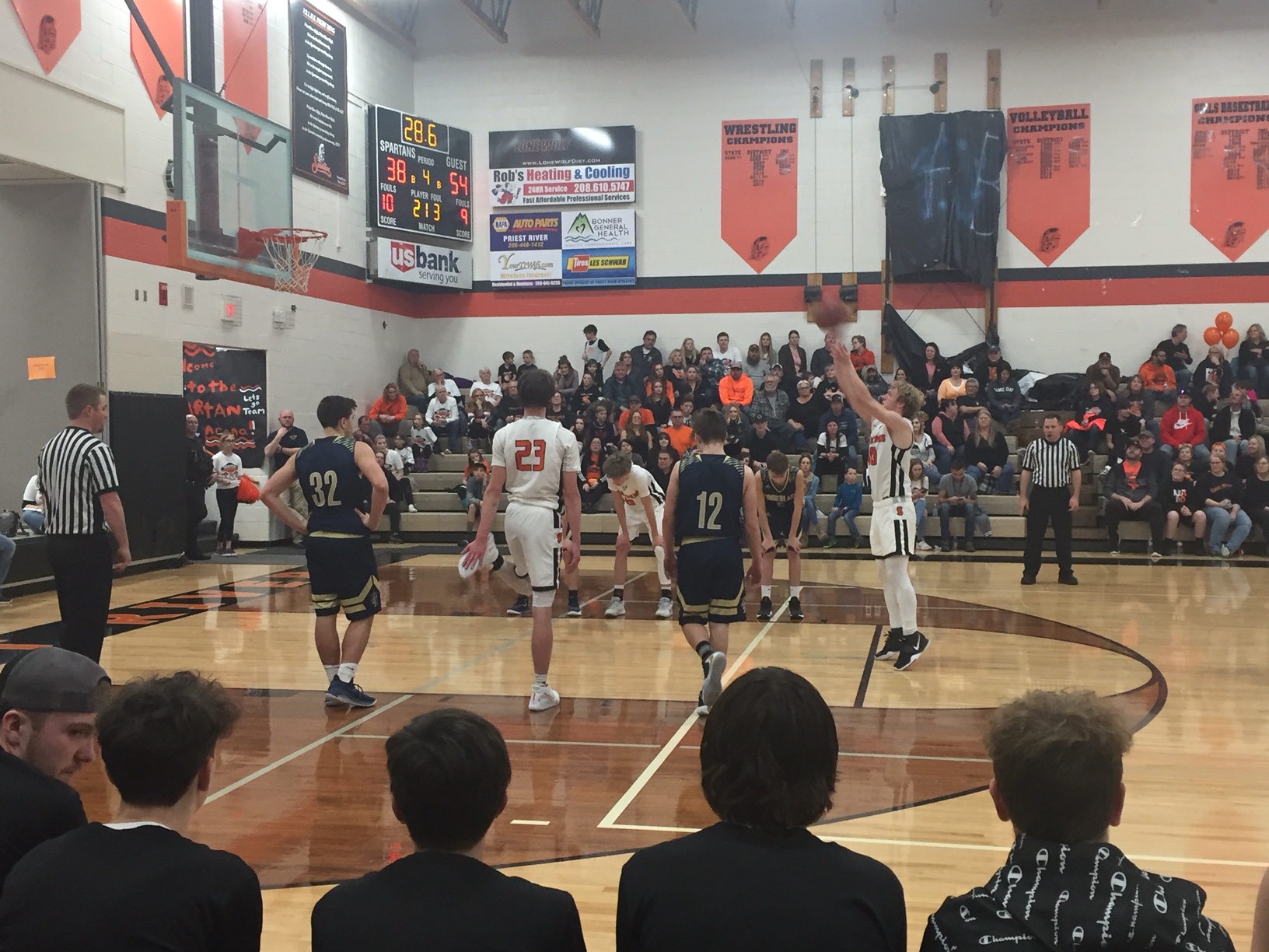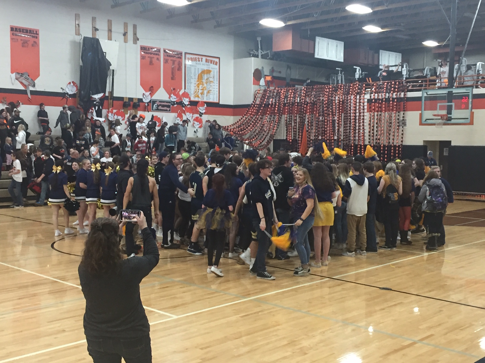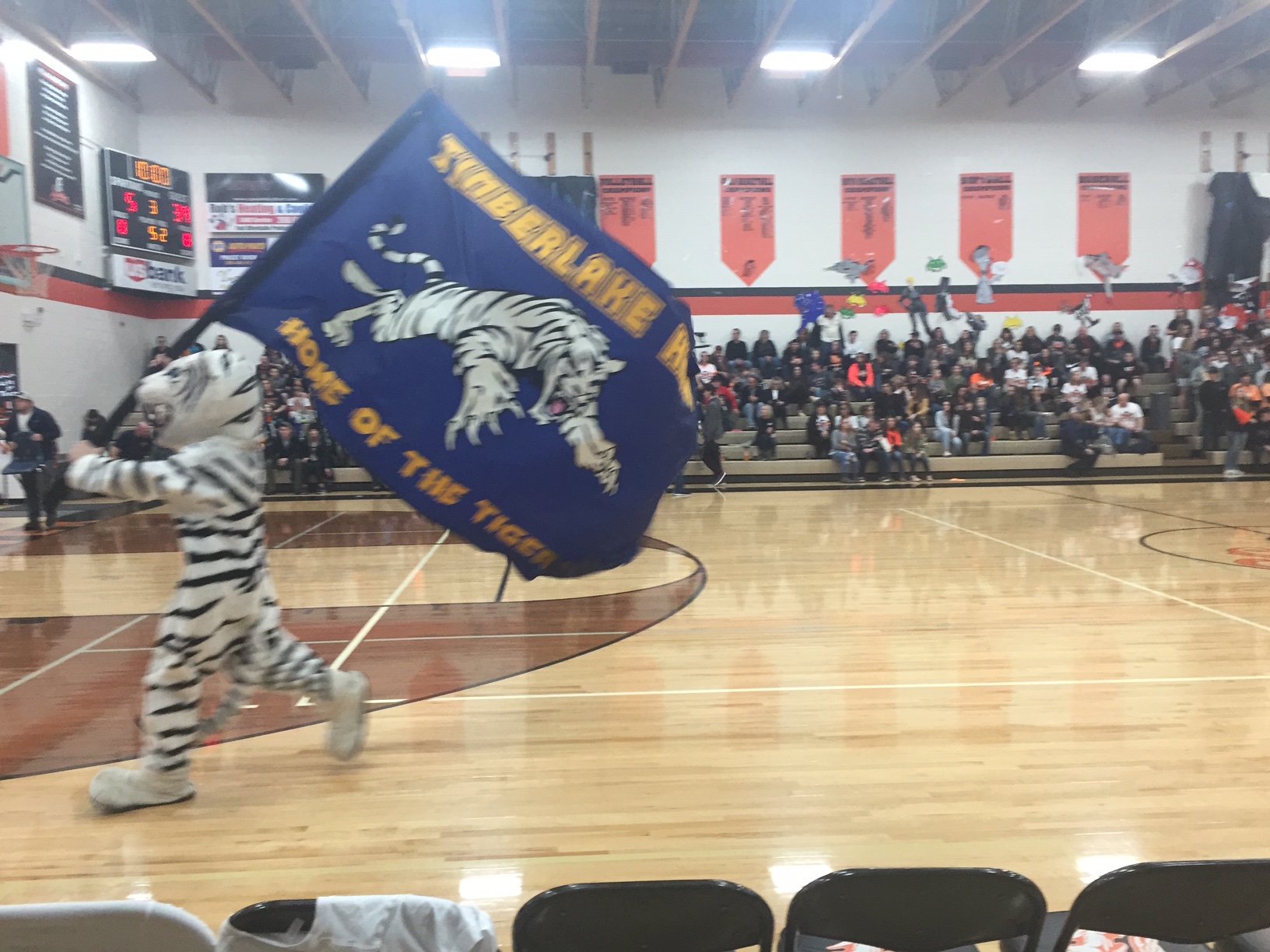 The Tiger boys won their game 56 to 40, although I think it would have been a little closer had the PR coach not lost it, but after the game ended a hush fell on the crowd, it was time to announce the winner of the Battle of the Buck. A teacher from Priest River held the orange painted side of the buck horns and teacher from Timberlake grasped the Navy blue side. The announcer began by saying the contest was close, only sixteeen points separated the winner and the loser, and.....TIMBERLAKE WON!