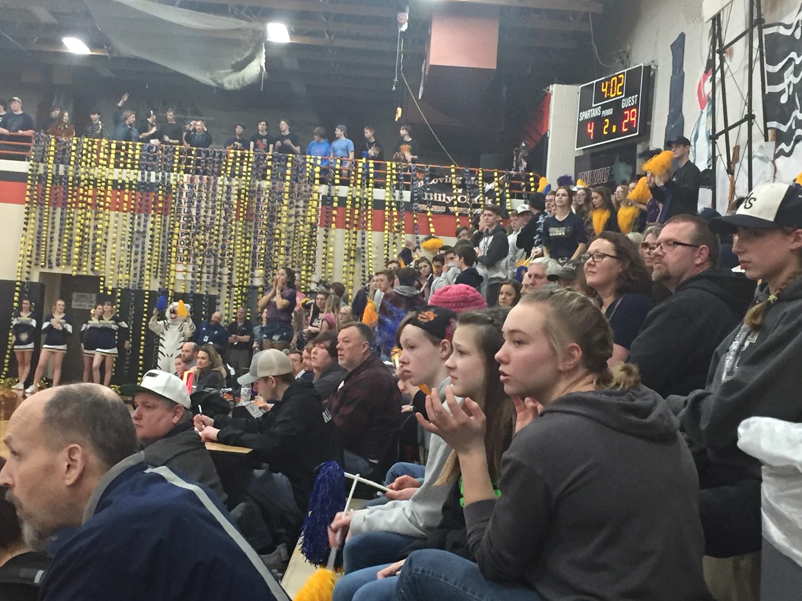 With all that explanatory-ness out of the way, I can move on to the meat of this post, the BOB competition. We arrived at the gym and got a seat before the start of the varsity girls game at 4. The children abandoned us for the visiting student section of the gym, and my eyes lit up with curiosity as I scanned the scene. Throughout the gym there was displays of orange and black (the Spartans colors) and navy and gold (our Tigers colors). Both sides of the gym were packed full of parents and students, clad in sports gear that had to make the local retailers squee with merchant money made joy. The bands from both schools were up in the weight room area and I giggled a bit when I spied each opposing side was decorated in more construction paper chains than I have ever seen in each of the school's colors.