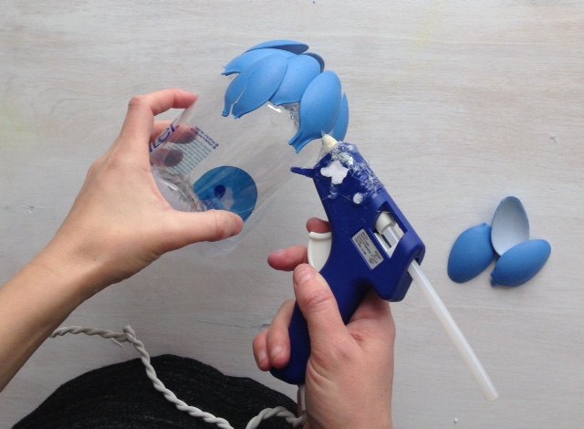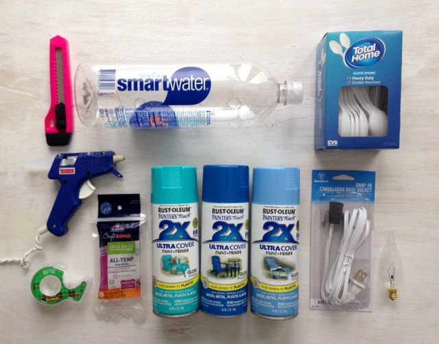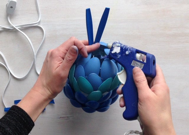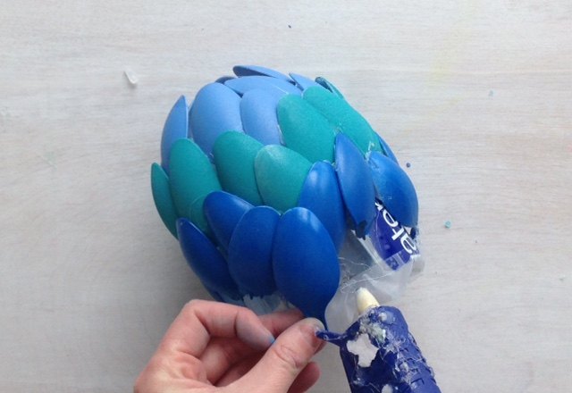 At the highest point of your water bottle, take your spoon handles and make a spiky best, much the same as you would see on a pineapple. No requirement for flawlessness here! I utilized a blend of craft glue and tape to follow it.