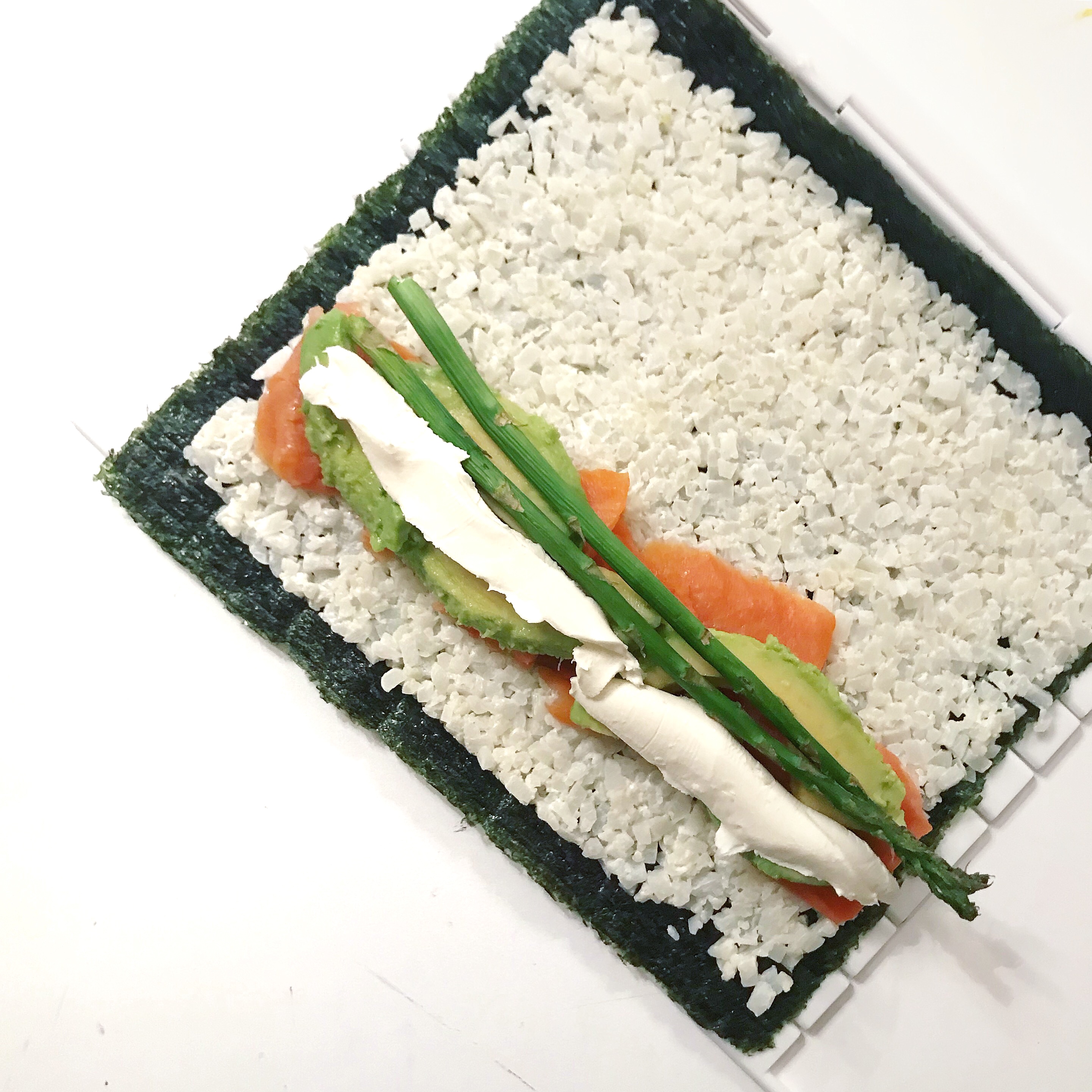 2. Optional: Mix 10 grams of cream cheese into the rice. This helps with binding the rice together. You can roll without the cheese mixed in, which is my preference because I try to limit my dairy intake.