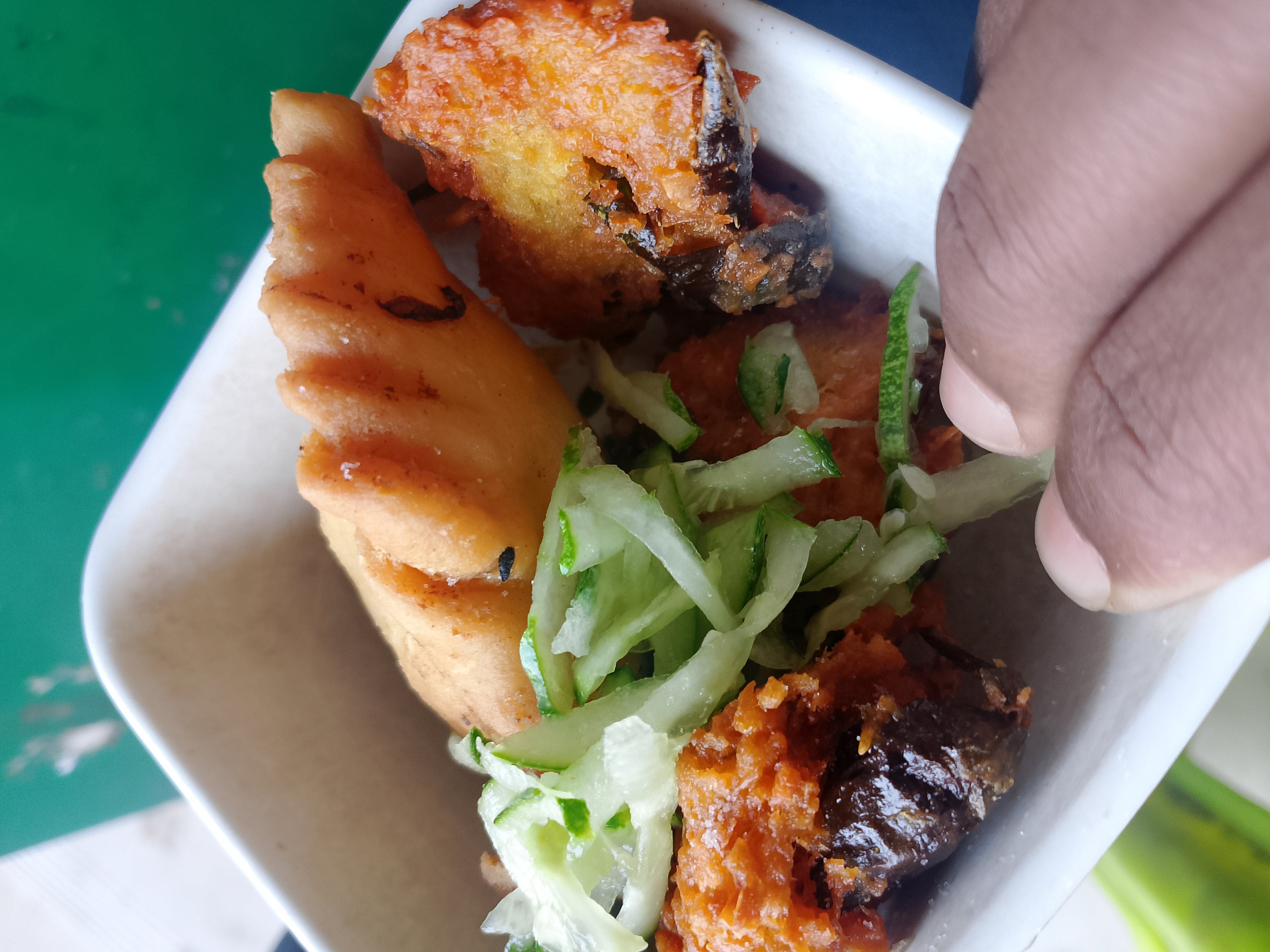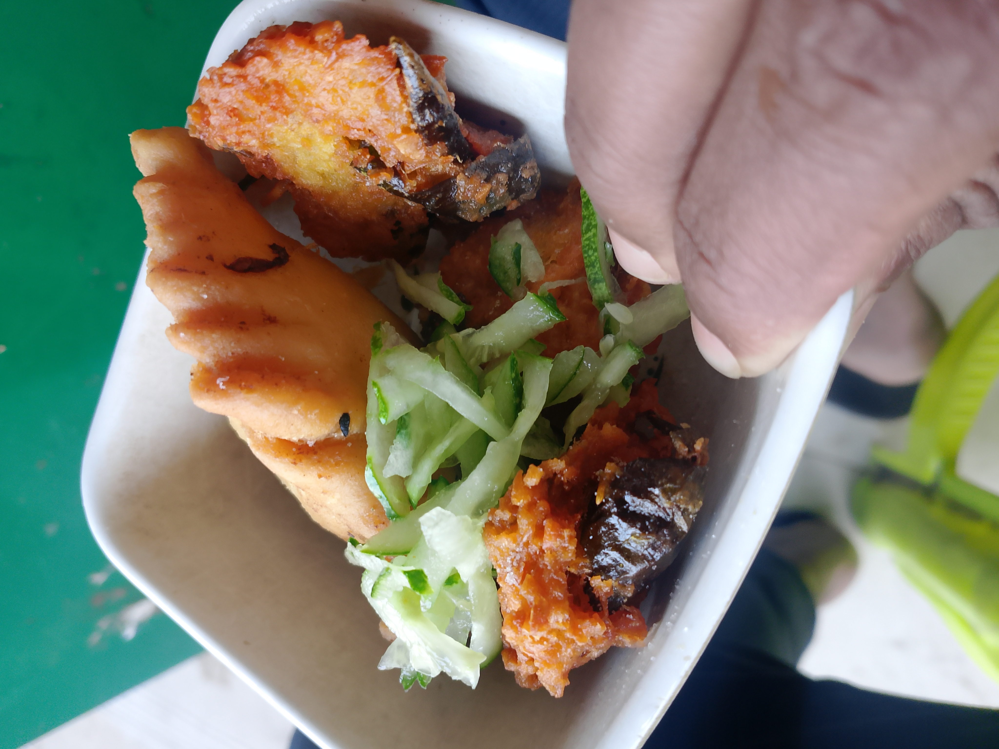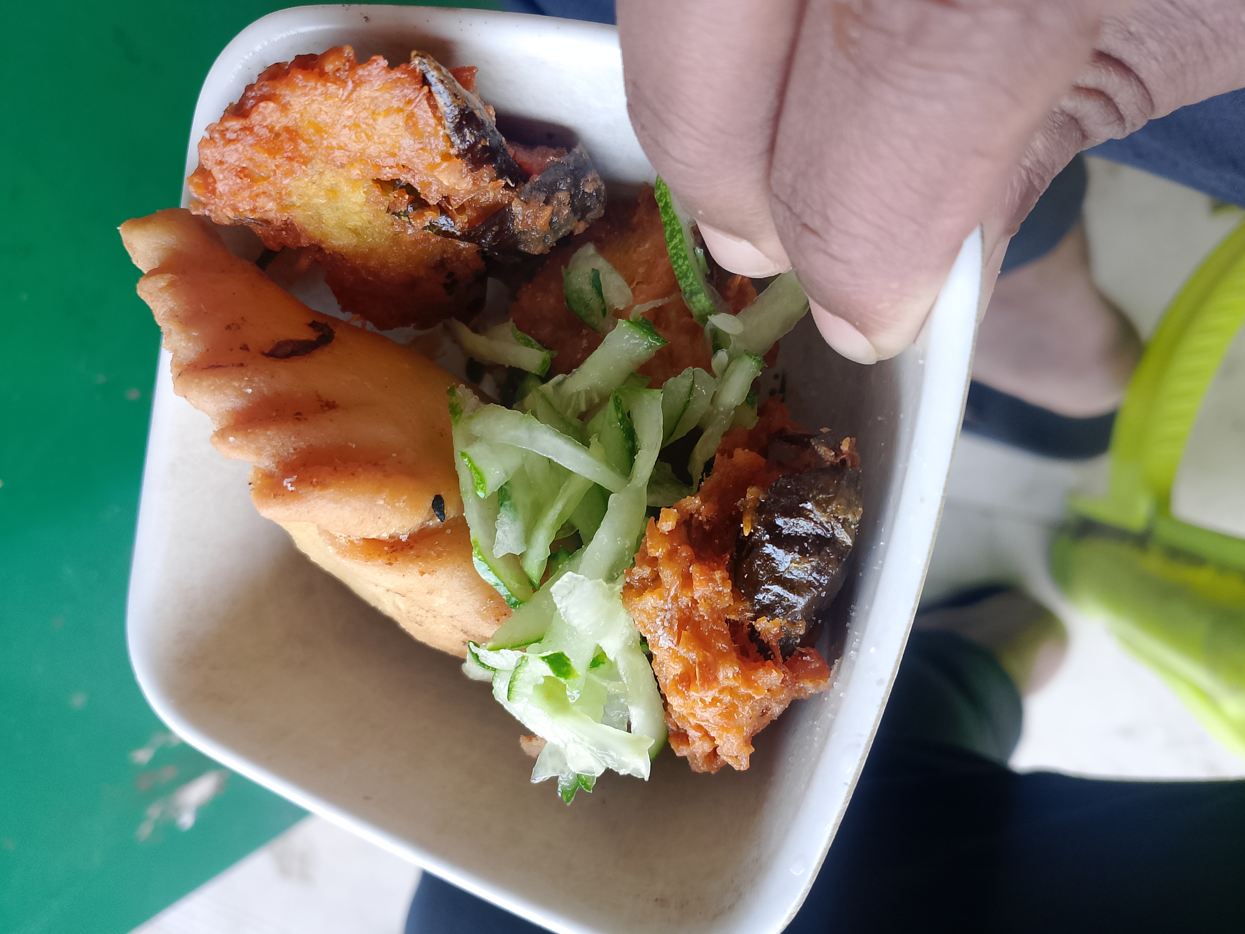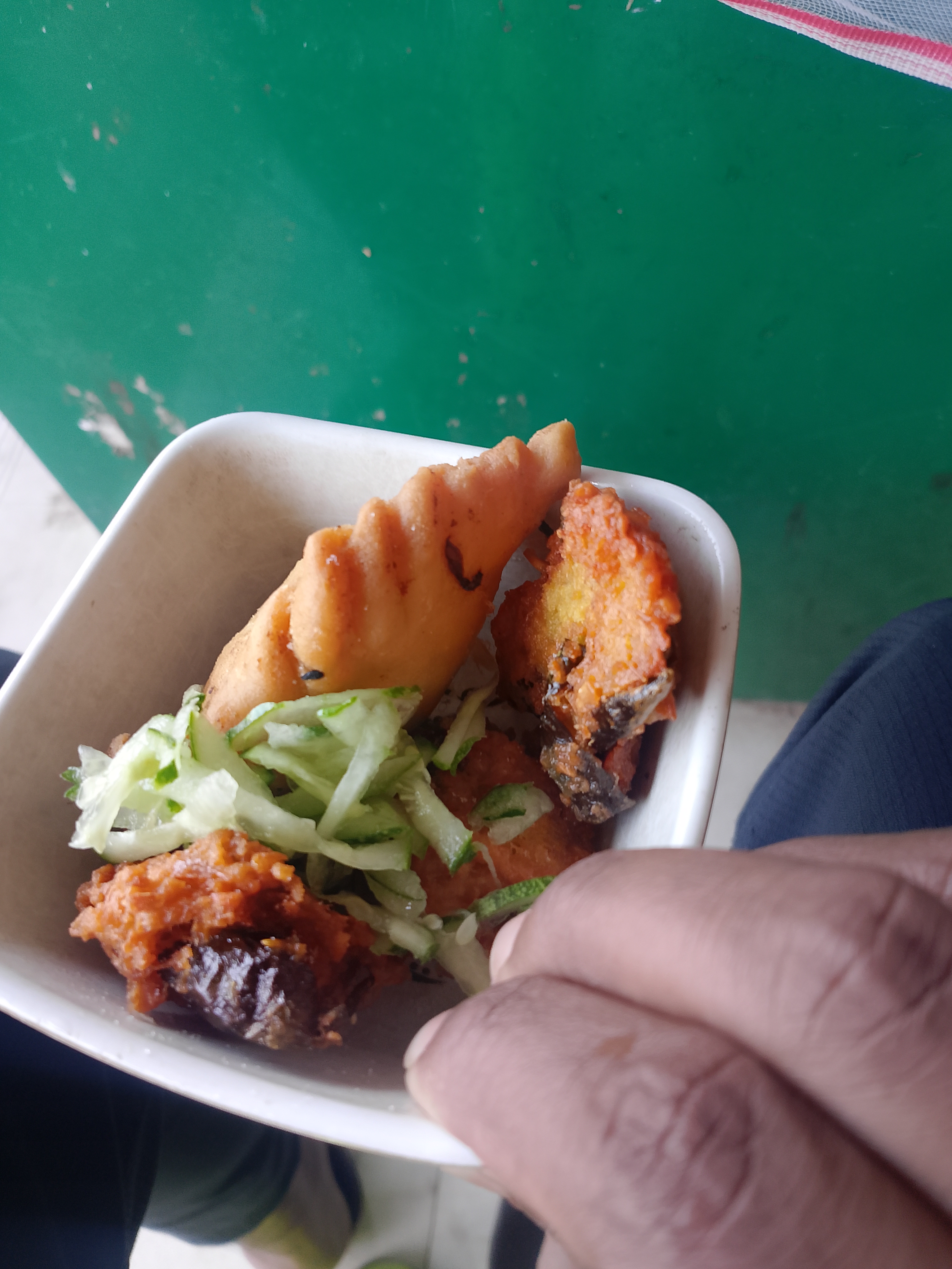 I had singara and piyaju as snacks. These hot foods tasted very good to me, and they were served with sliced cucumber. The snacks were really enjoyable and quite tasty. I ate them this afternoon, and I liked them very much.