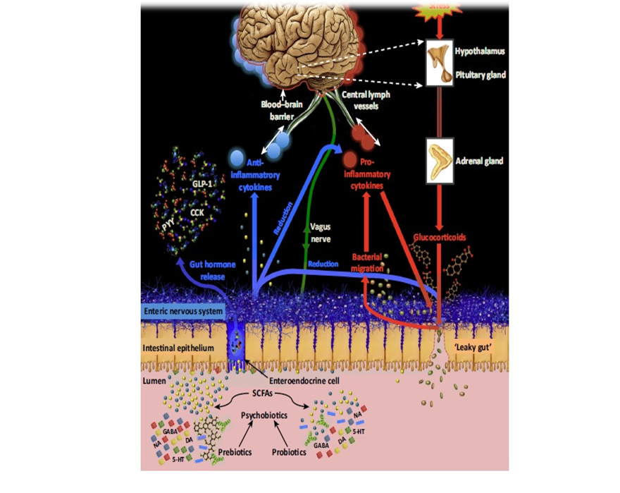 Son çalışmalar, bağırsak mikrobiyotasının MSS (Merkezi sinir sistemi) işlevine olan önemini ortaya koymaktadır. Beyin ve bağırsak arasındaki iki yönlü iletişim uzun zamandır bilinmektedir. Kurulan iletişim yolları, otonom sinir sistemi (ANS), enterik sinir sistemi (ENS), nöroendokrin sistemi ve bağışıklık sistemini içerir.