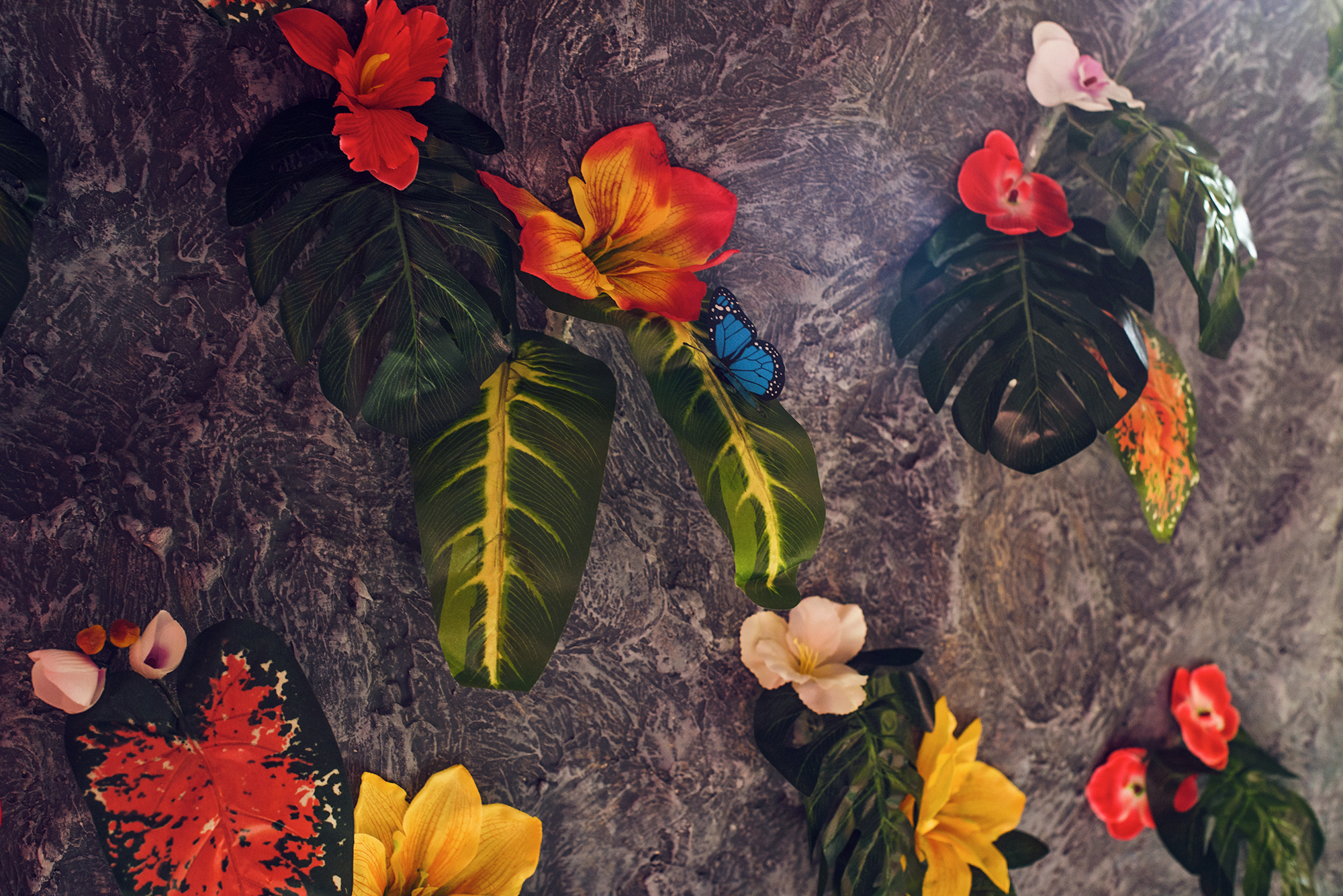 That's it, the mountain is ready! Then you can decorate it with various decorative elements, for example, lianas, exotic leaves, flowers and the like. We laid artificial turf on the floor to make it more like nature, and decorated it with ornamental shrubs.