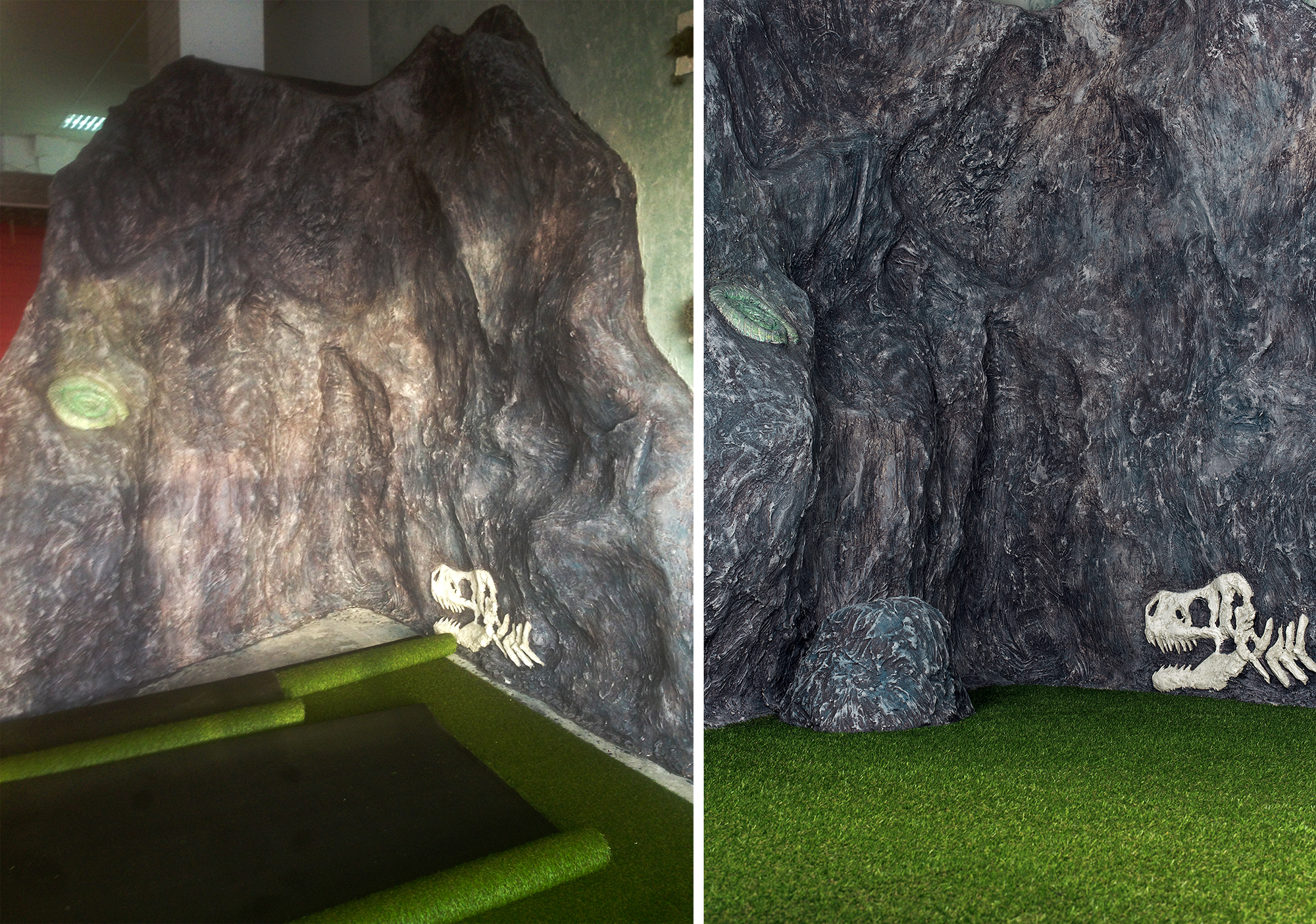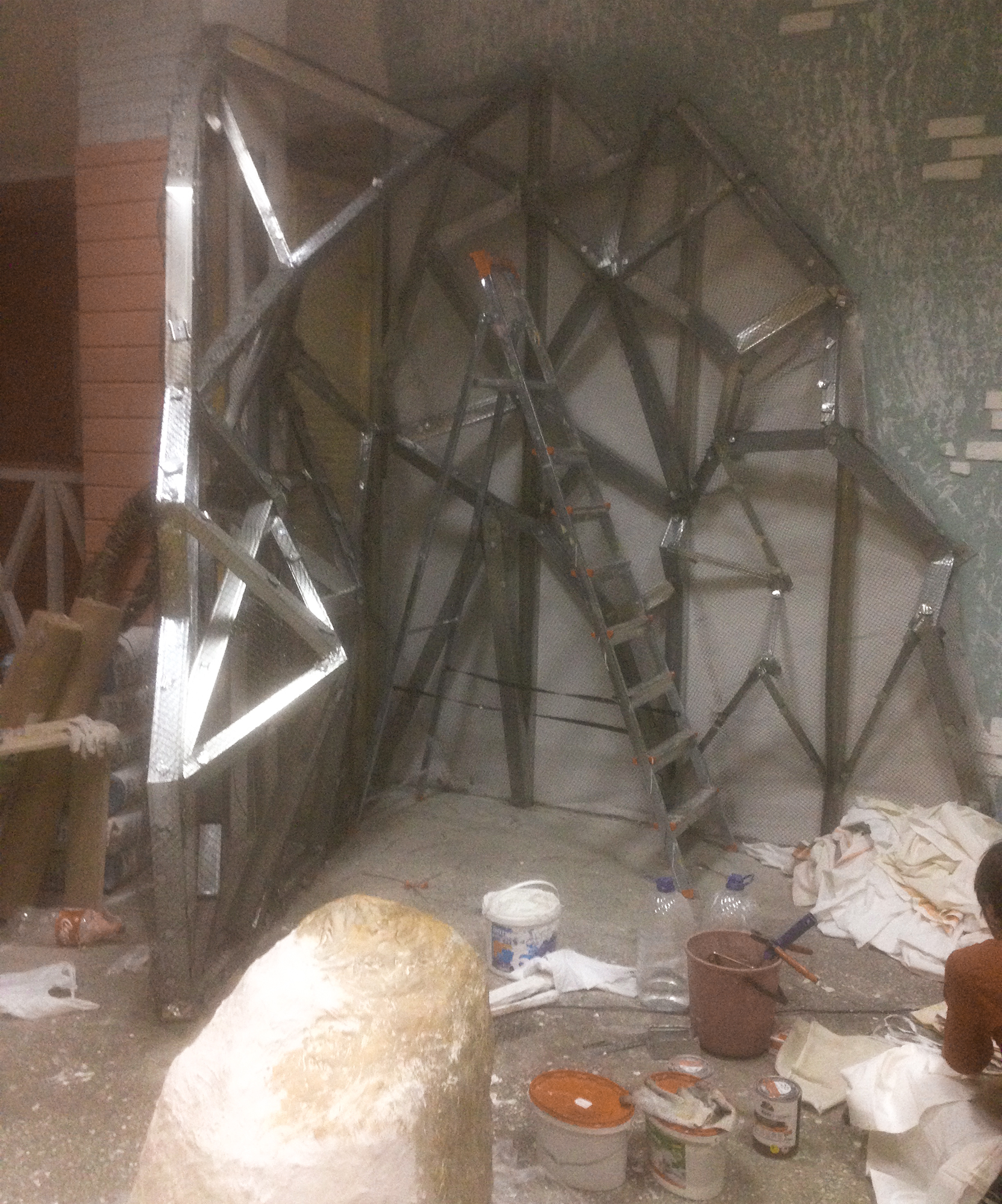 In the photo on the left we see a clean frame of one of the sides of the mountain. The lower profiles are drilled to the floor, extreme with the walls and between themselves, thus a durable construction is obtained. In the photo on the right, we already see decorative lines, which will be responsible further for the cambers and cavities that imitate natural rocky bends.