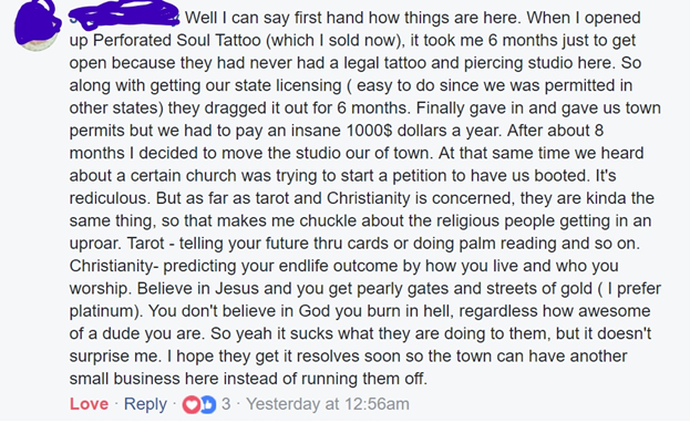 While I don't subscribe to any religion, I believe this man is being unjustly targeted. We had a tattoo shop that had similar things happen to him.