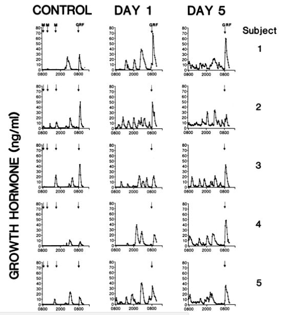 Another study done in 1988 https://www.ncbi.nlm.nih.gov/pubmed/3127426 showed similar results. In this graph below you can see that meals marked with M effectively suppressed human growth hormone as expected. During feeding there is an increase in glucose which directly suppresses human growth hormone. The data is very clear that fasting is a great stimulus for the secretion of human growth hormone, and https://www.ncbi.nlm.nih.gov/pubmed/1548337 this research shows a 5 fold increase in human growth hormone in response to a 2 day fast.