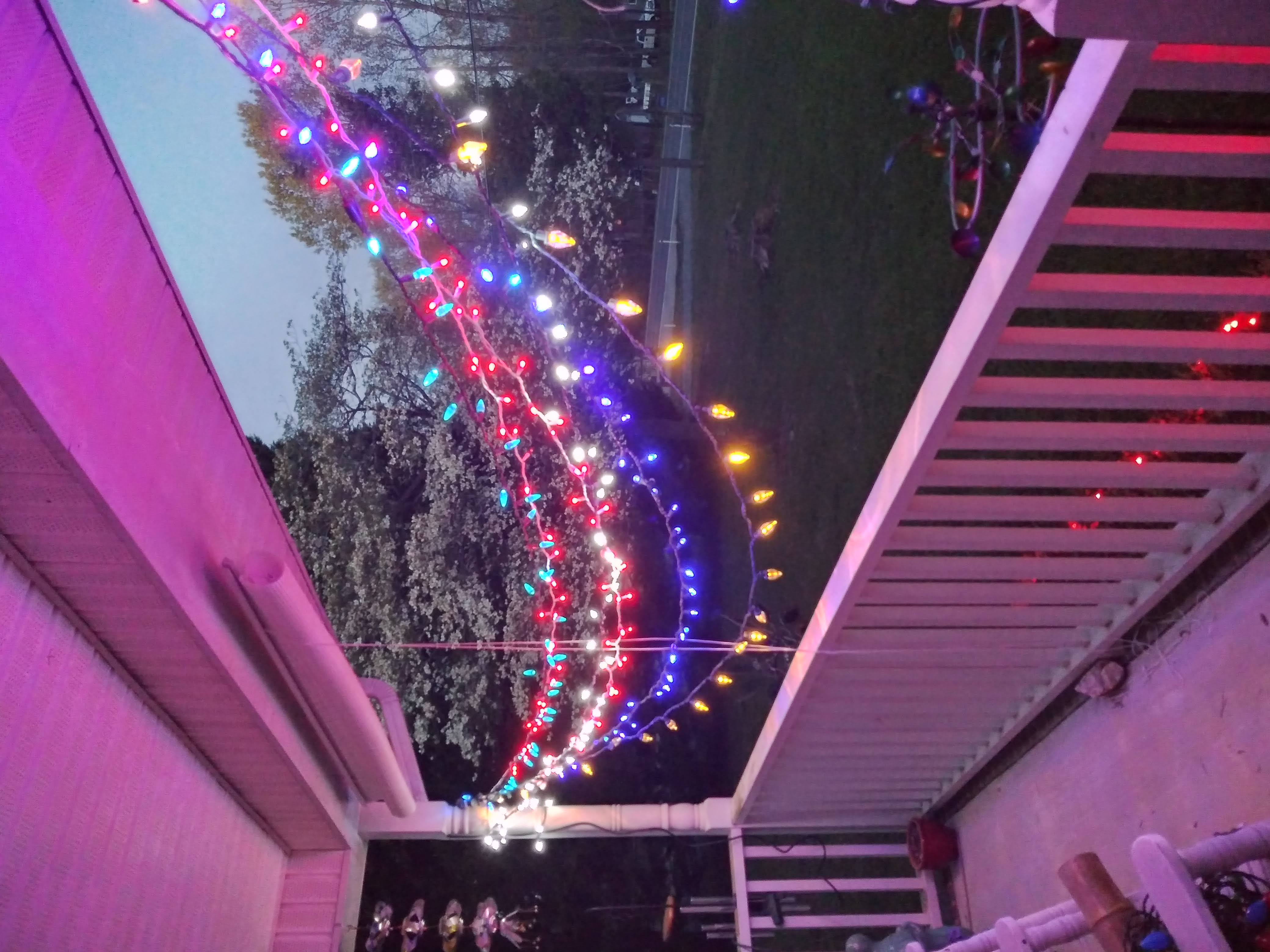 Somehow, as much as I adore all things Christmas, I didn't seem to want to do that, however, I also love outdoor lights of any kind, so my mind went over what all I might have and what I could do with it. I came up with some red, white and blue random strings of lights and yesterday I hung them across my front porch.