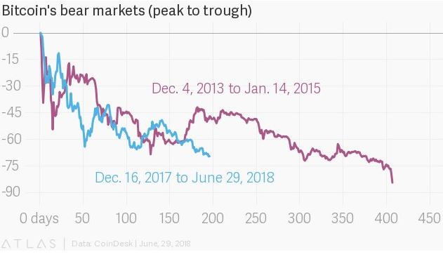 Quartz released a chart comparing mid-price trends for Bitcoin between 2014 and 2018, and analyzed the move based on the beat coin movement from December 2017 to June of this year.