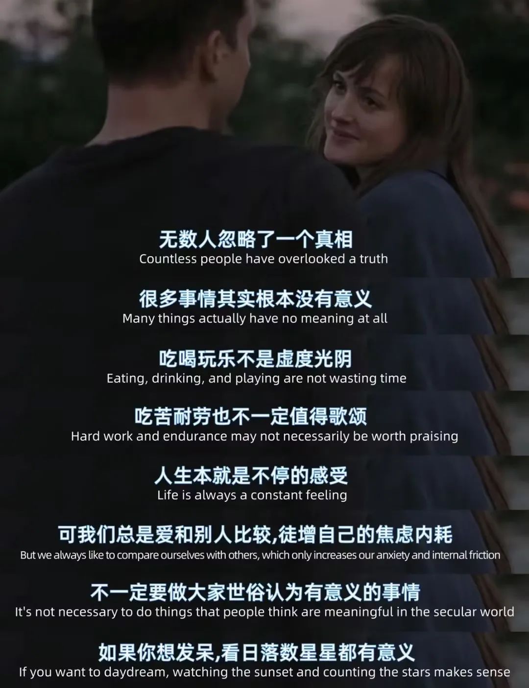 我们不用每天紧绷,做得不好也没关系,达不成目标也没关系,照顾好自己的情绪,让身体和灵魂开心,好好感受当下,不被错过的时间和遗憾所困扰,好好做好现在的事情才是最重要的。