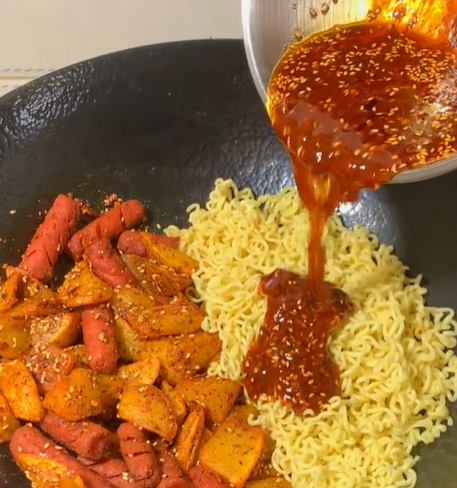 6⃣ 면을 넣고 양념을 뿌린 후 교묘하게 섞어서 드실 수 있습니다~