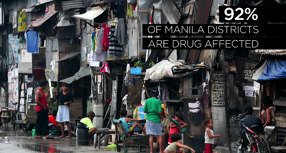 In the most populated metro area of Manila, roughly 92% of the districts are affected by drug use.