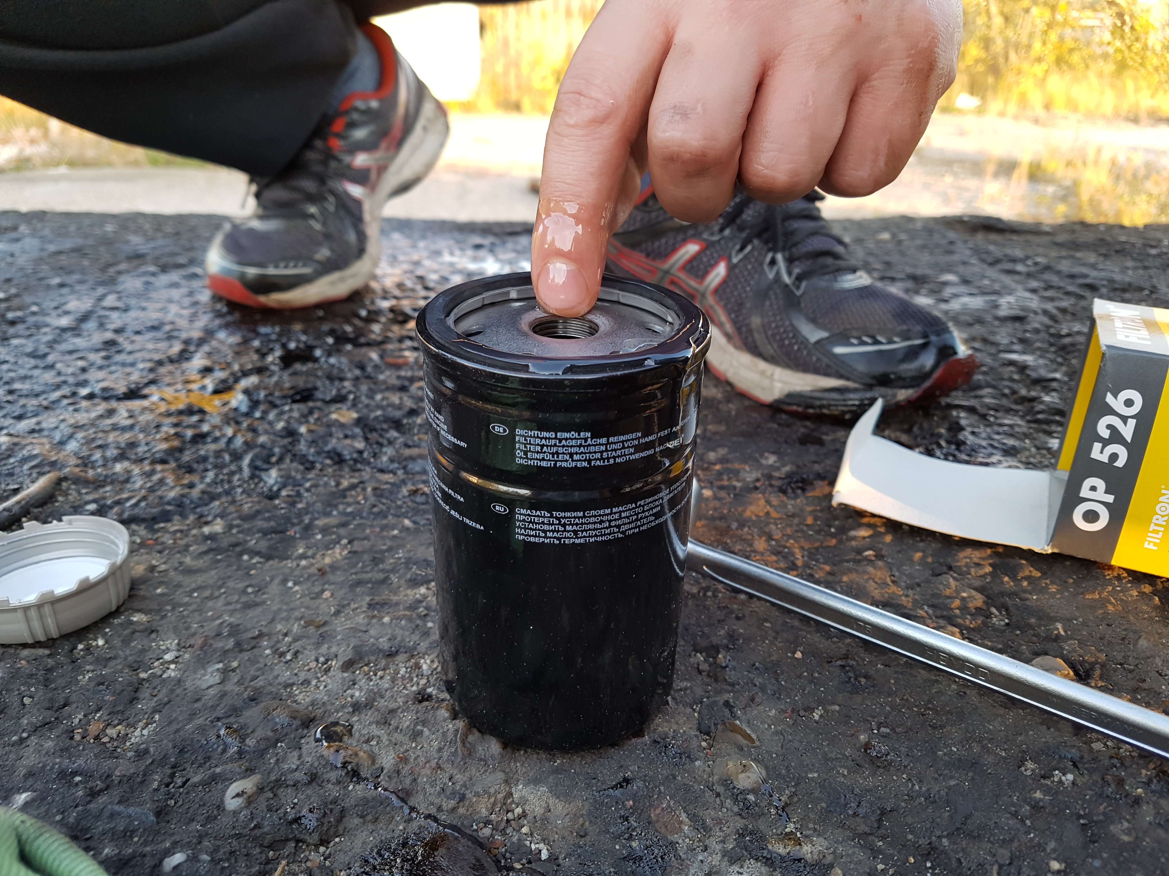 Przed wkręceniem filtra smarujemy paluchem uszczelkę nowym olejem, tak aby przy jego wkręcaniu owa uszczelka nie skręciła się i nie spowodowała wycieku. Filtr wkręcał mój kuzyn ręcznie, ma więcej pary w łapach niż ja. Przecieków brak jak do tej pory.