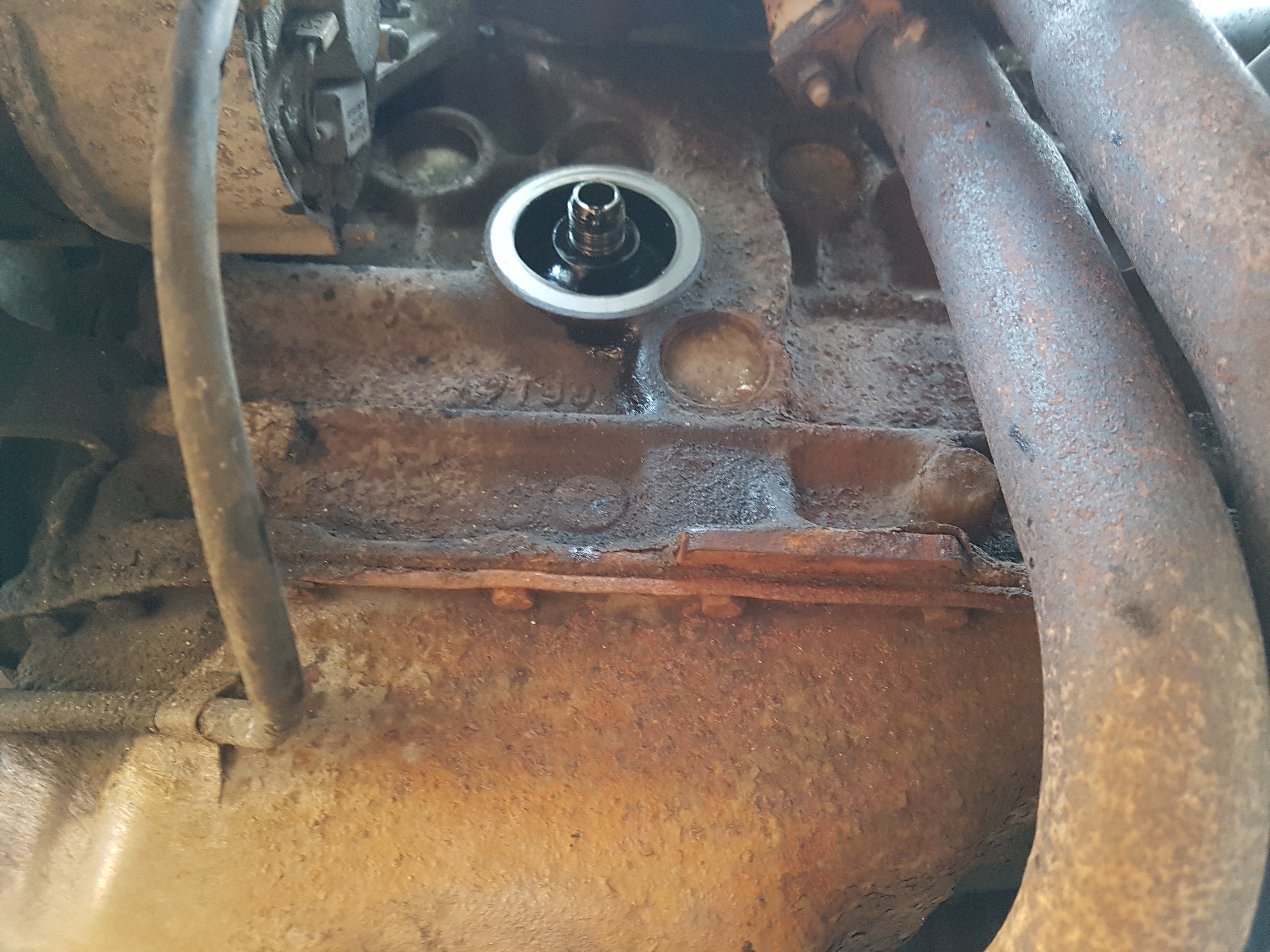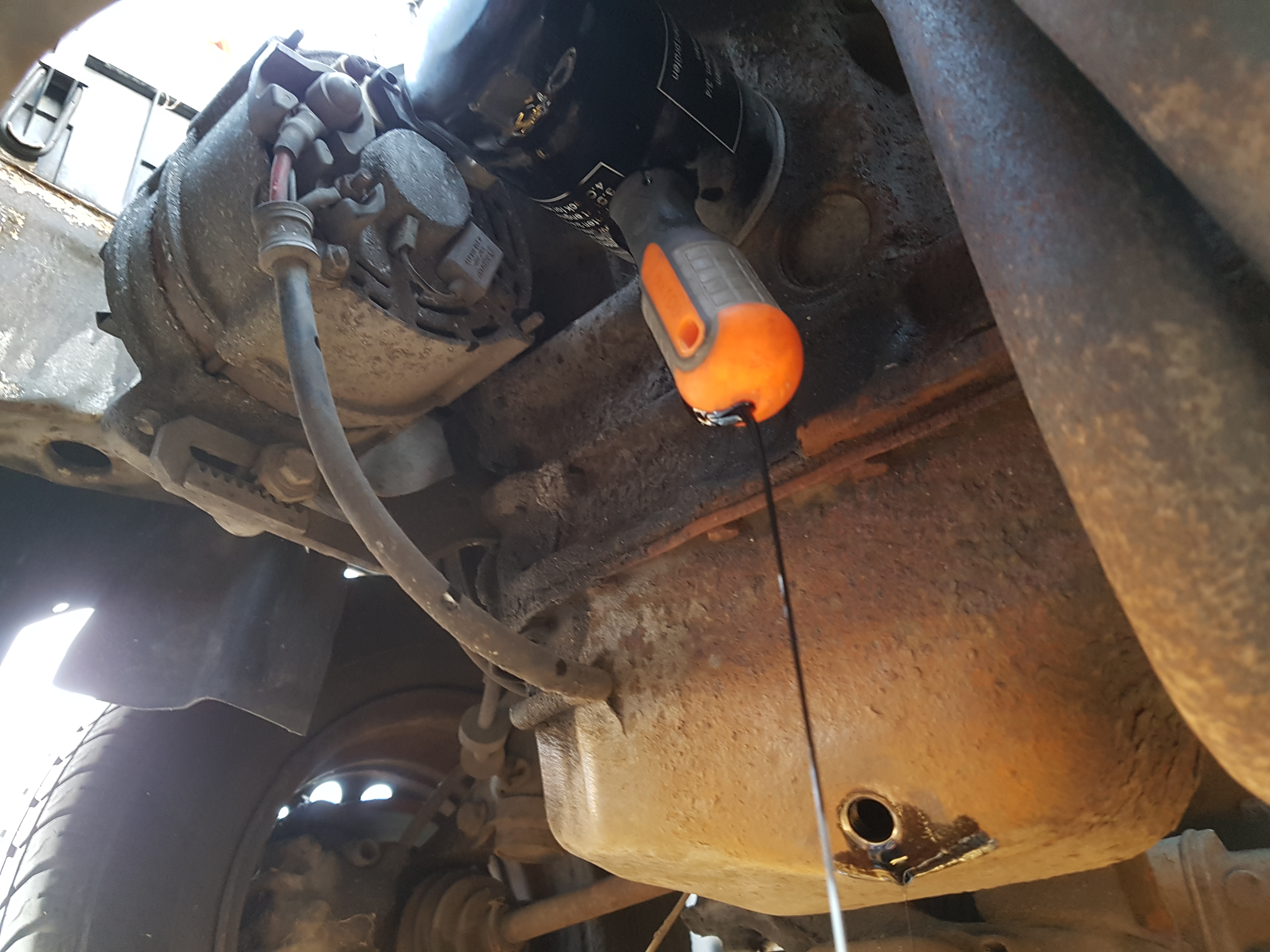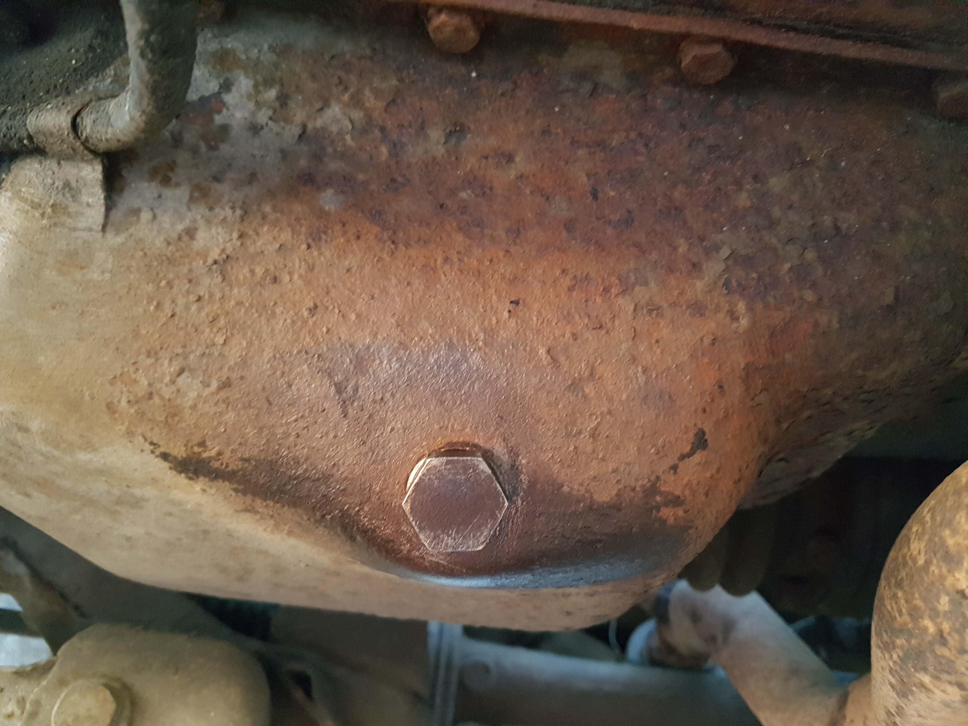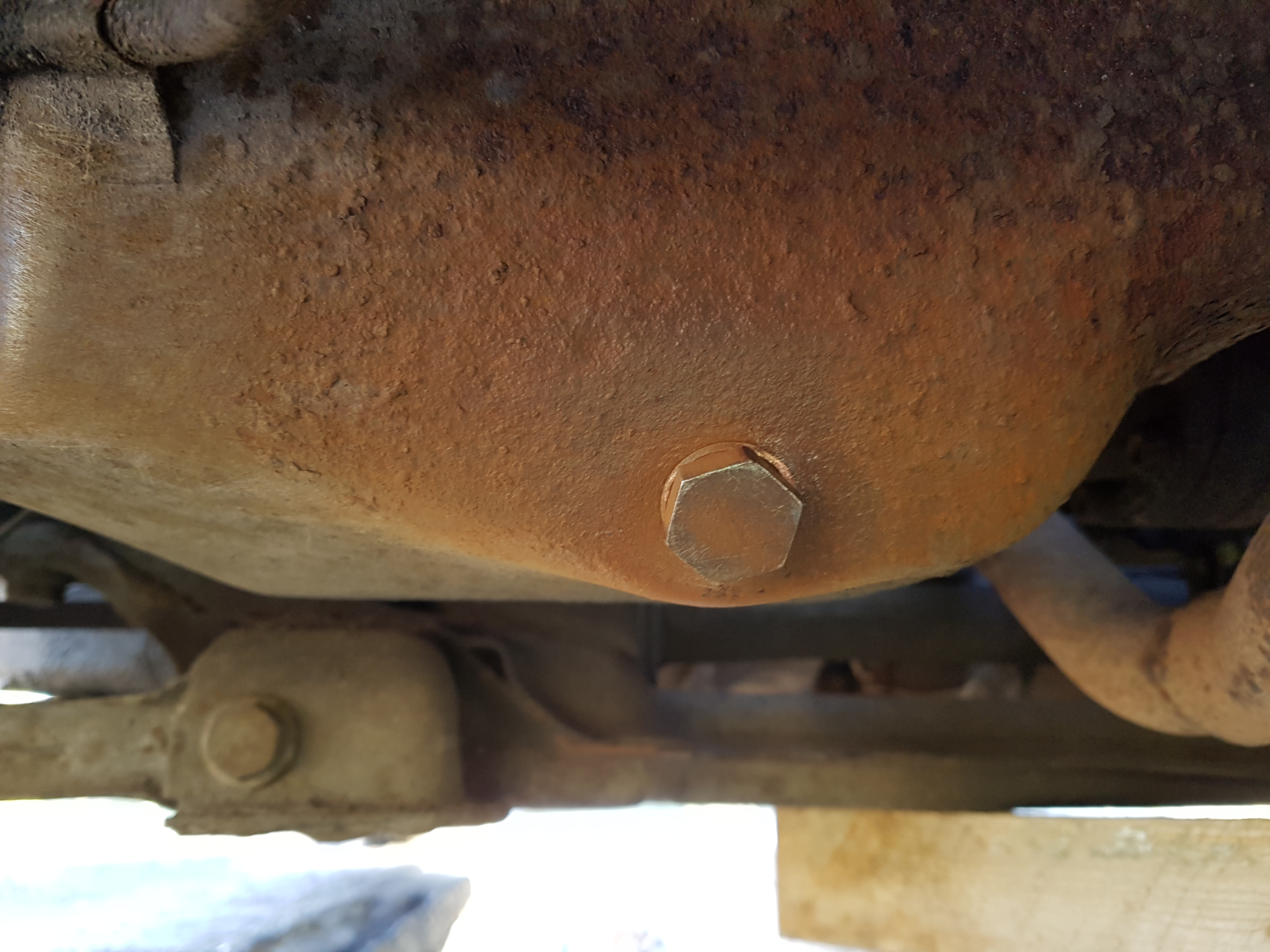 Znajdujemy w końcu korek spustowy oleju, sam korek i jego otoczenie nie wyglądają zbyt przyjaźnie.