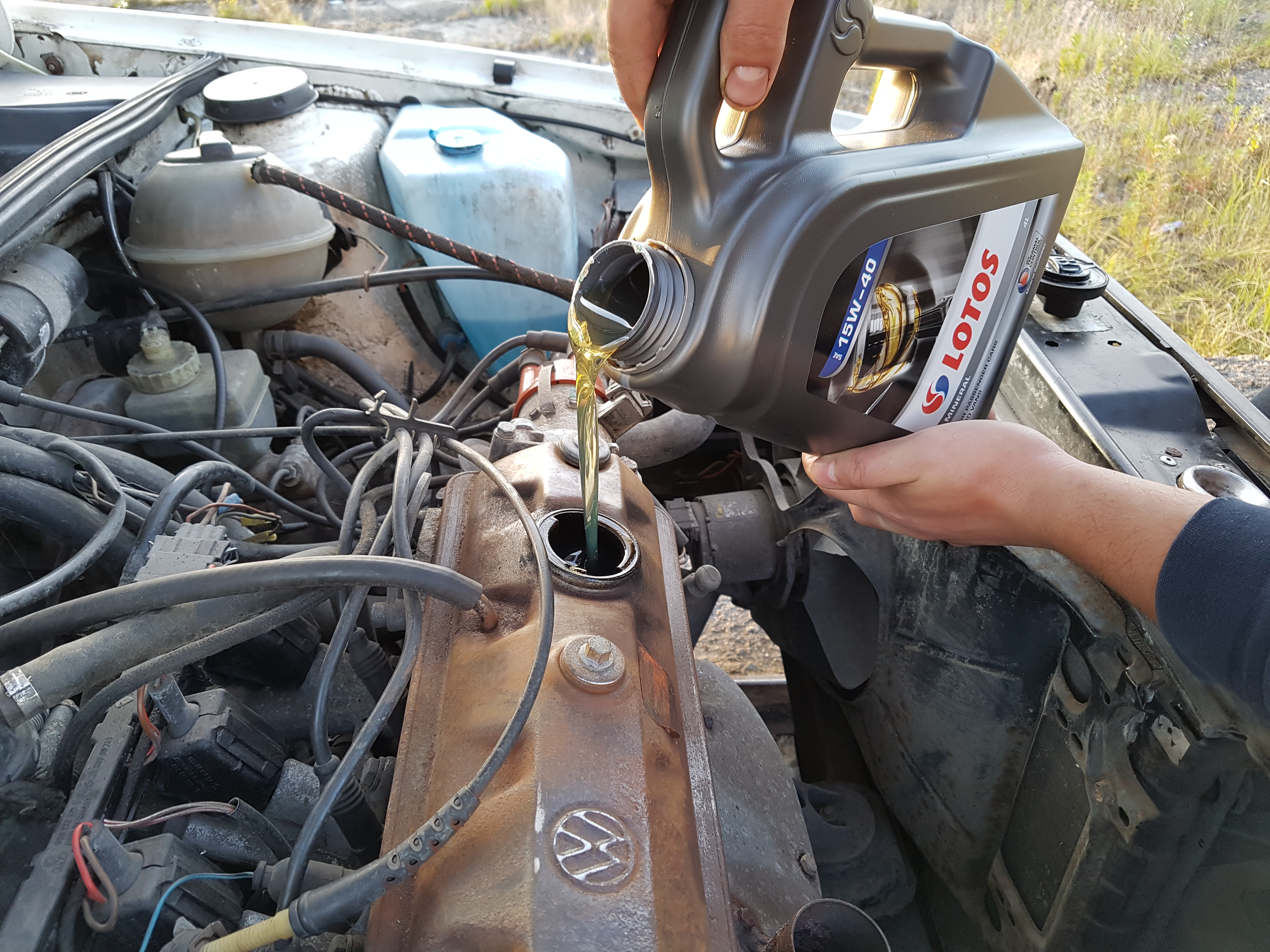 Gdy już wkręciliśmy korek i filtr to czas na wlanie świeżego smarowania. Kupując olej sprzedający, wyszukując po modelu auta, powie nam ile pije na wymianę nasz potworek. W moim przypadku jest to 3,5 l.