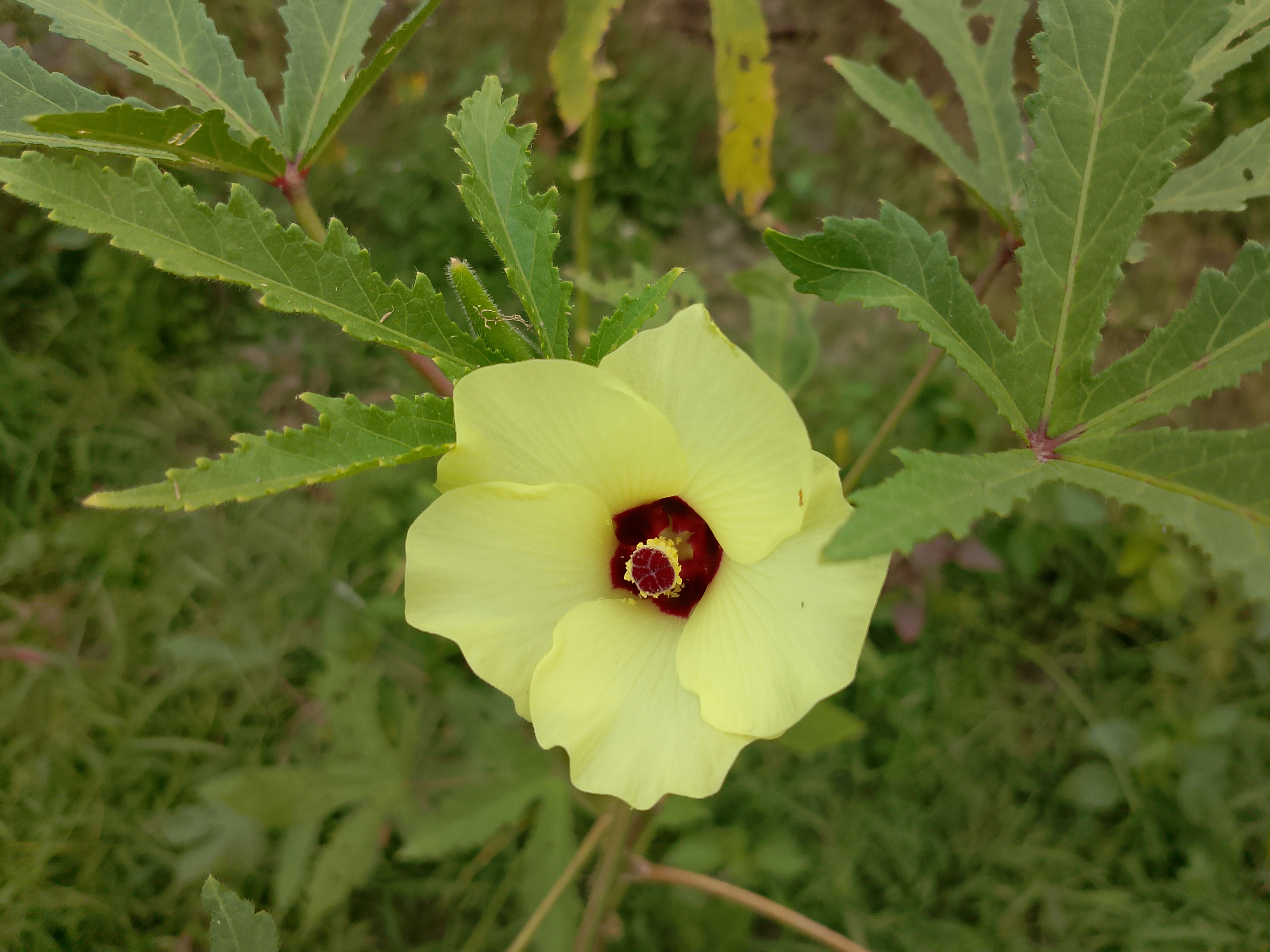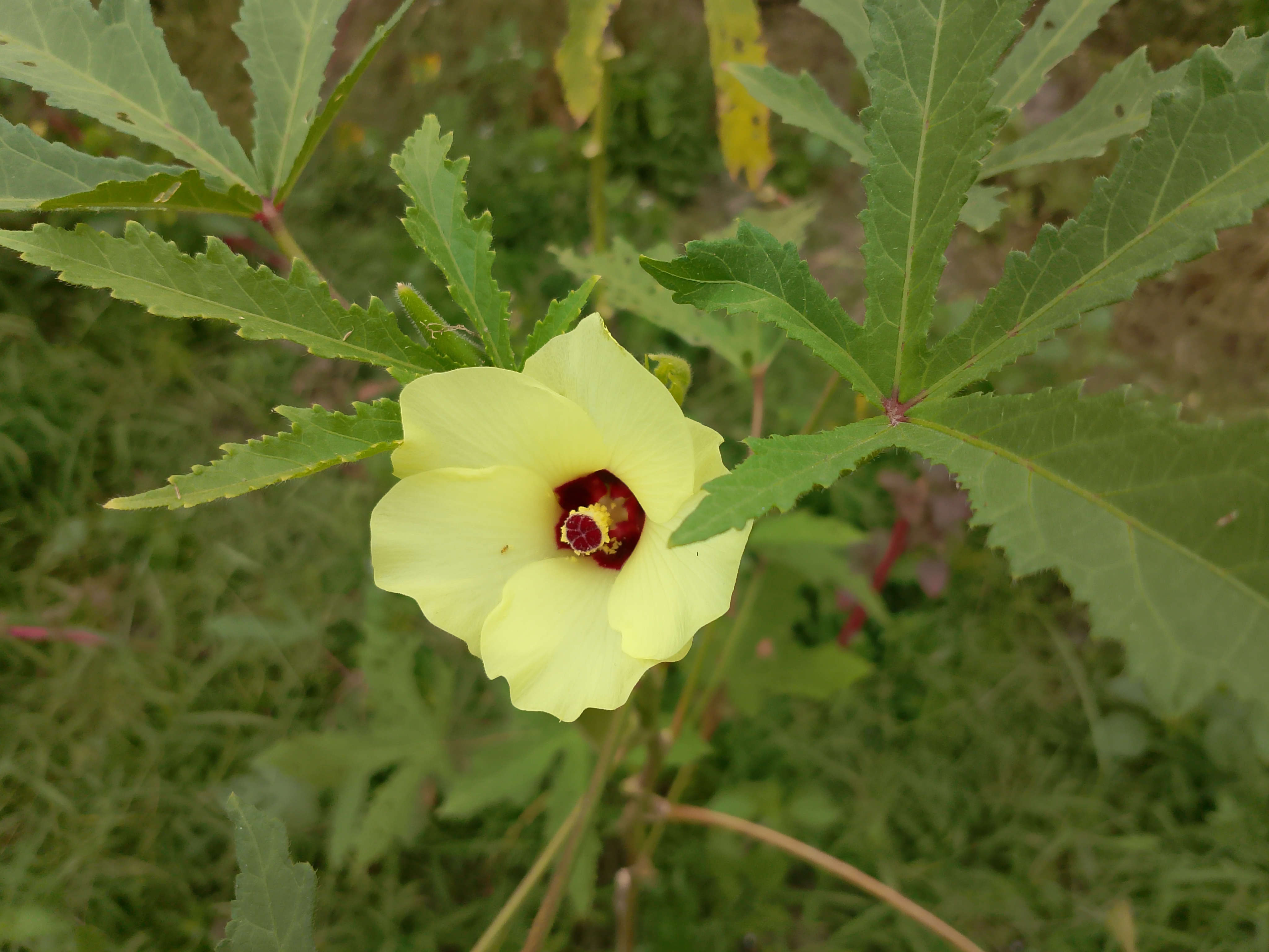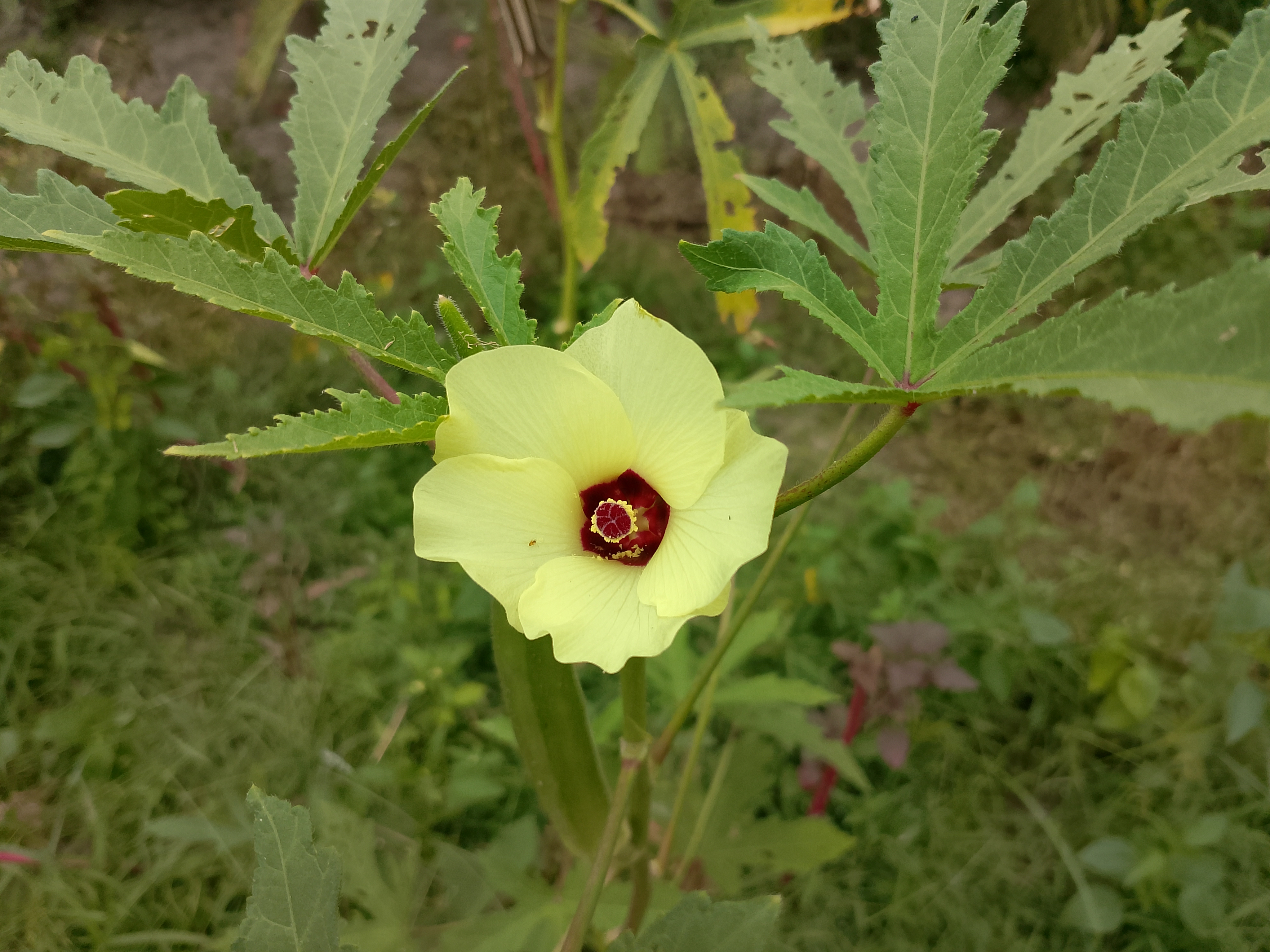 The okra plant has a beautiful flower. This flower lasts for only a few days and then falls off. Its petals are long, pointed, somewhat yellow in color, and have red in the middle, which looks very nice. I saw a picture of this flower, and when I went down to the field at home, I saw it in person.