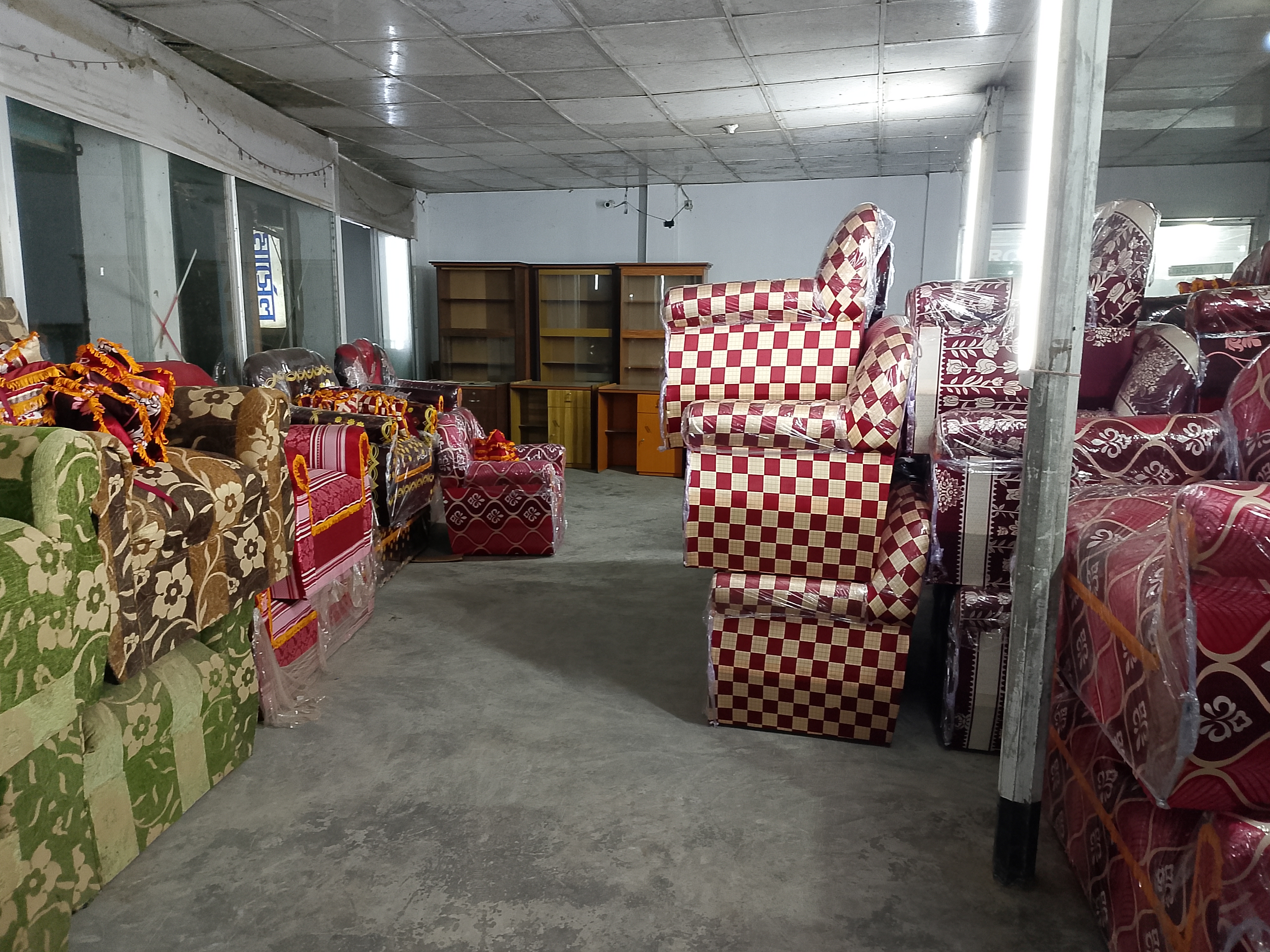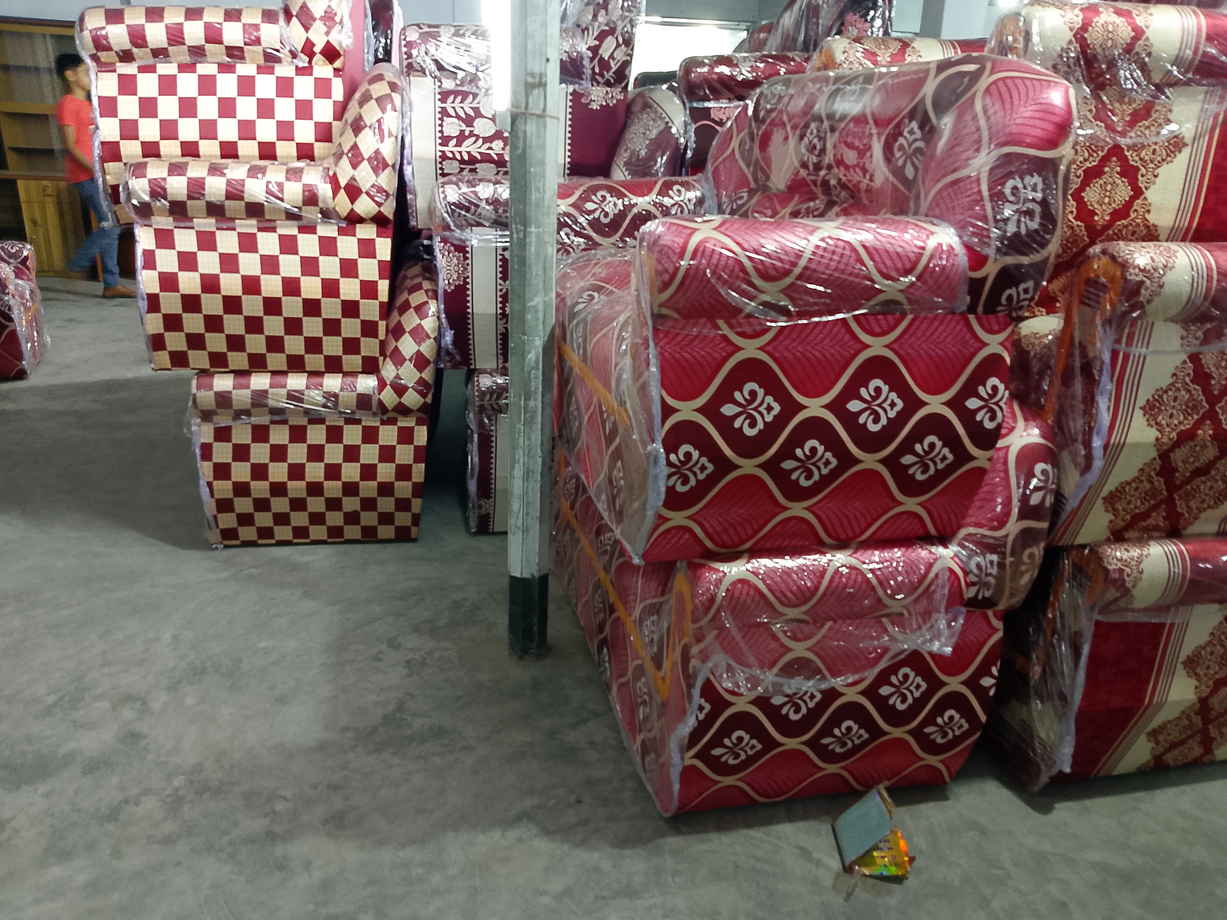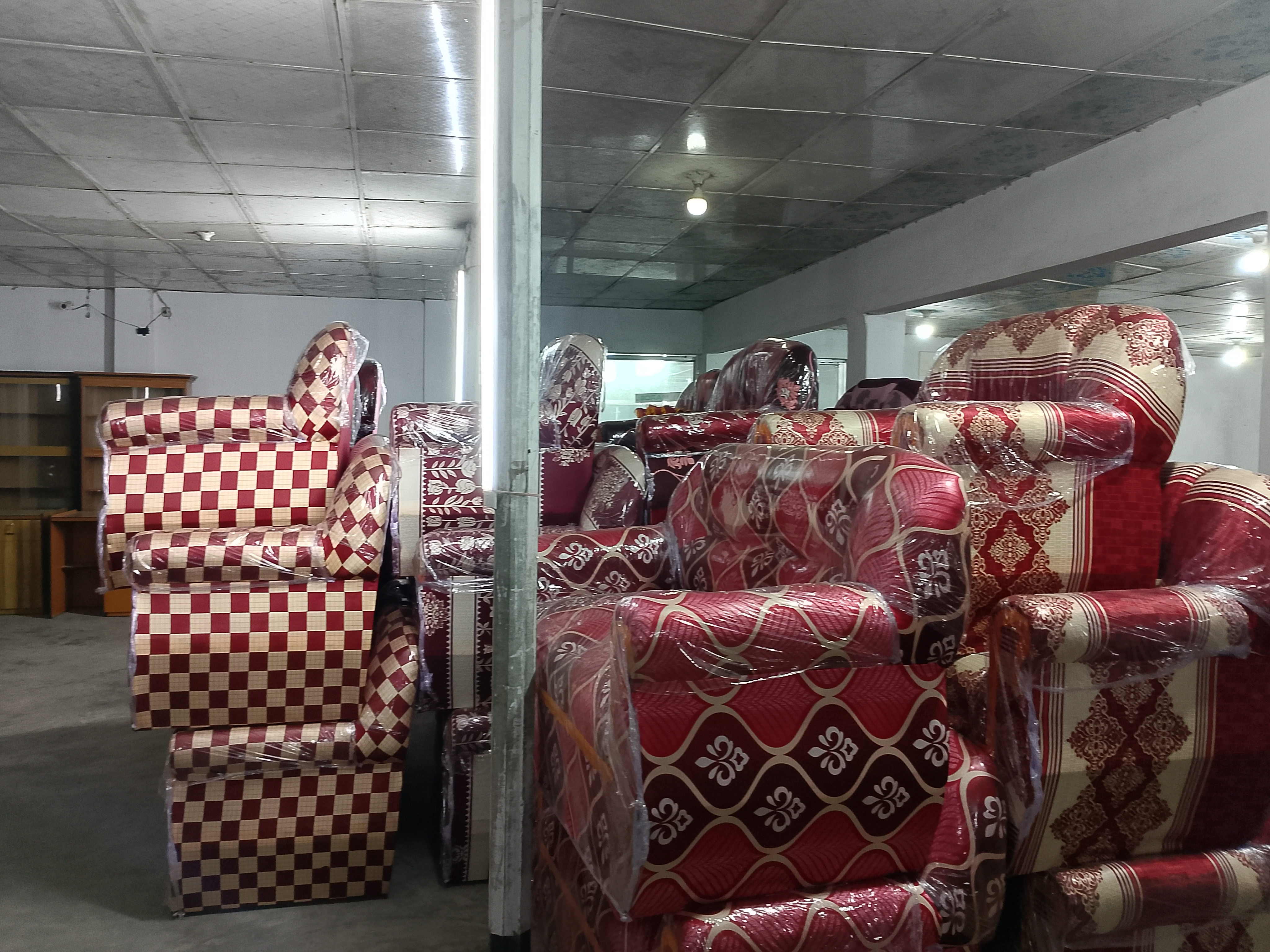 The sofa set is made of foam. These sofa sets are readymade and available in stores. Today, we visited one such store. The sofas are made in a very beautiful category. Usually, when you custom-make a sofa, it can be quite expensive, but here you can get them at a much lower price.