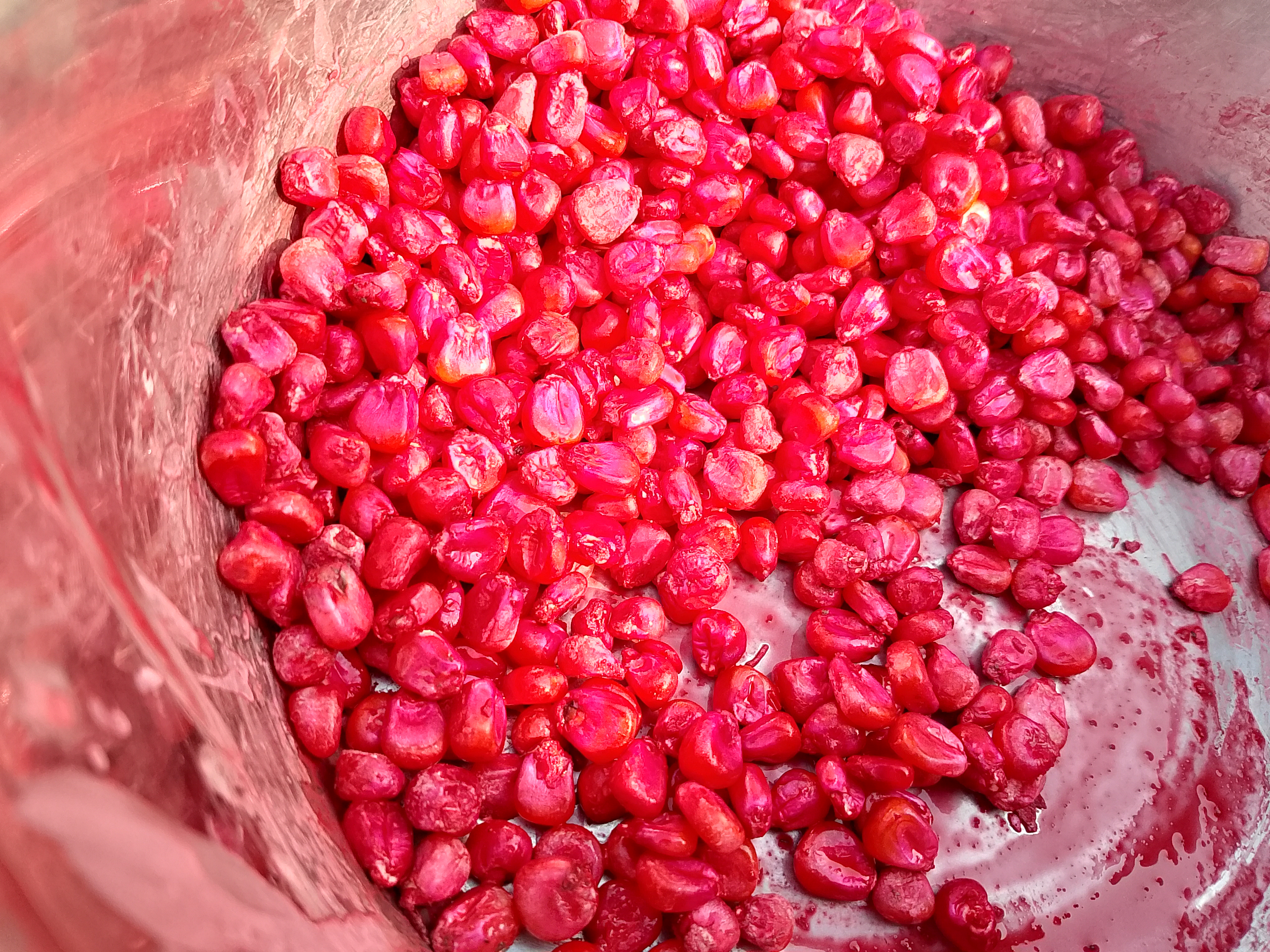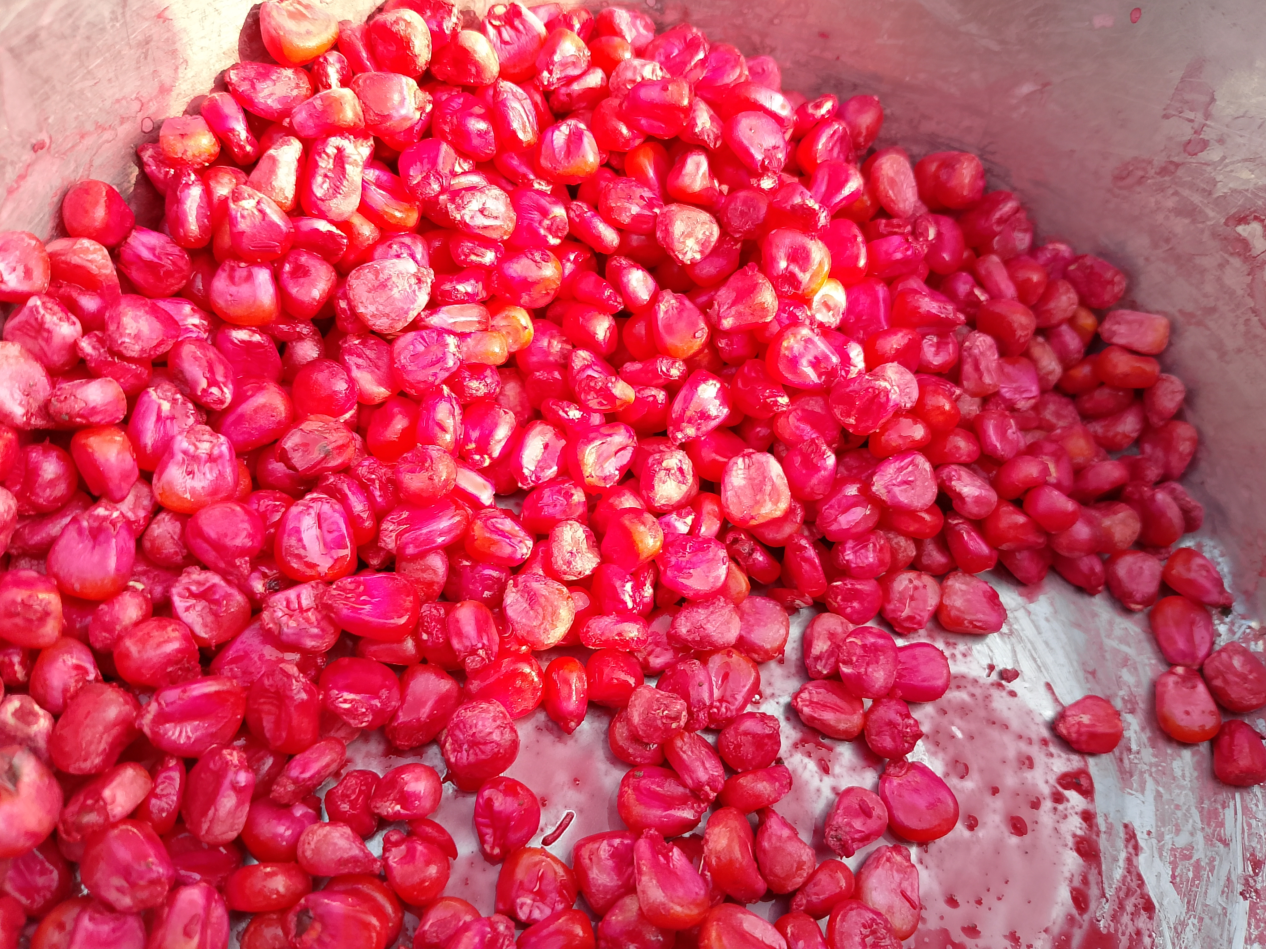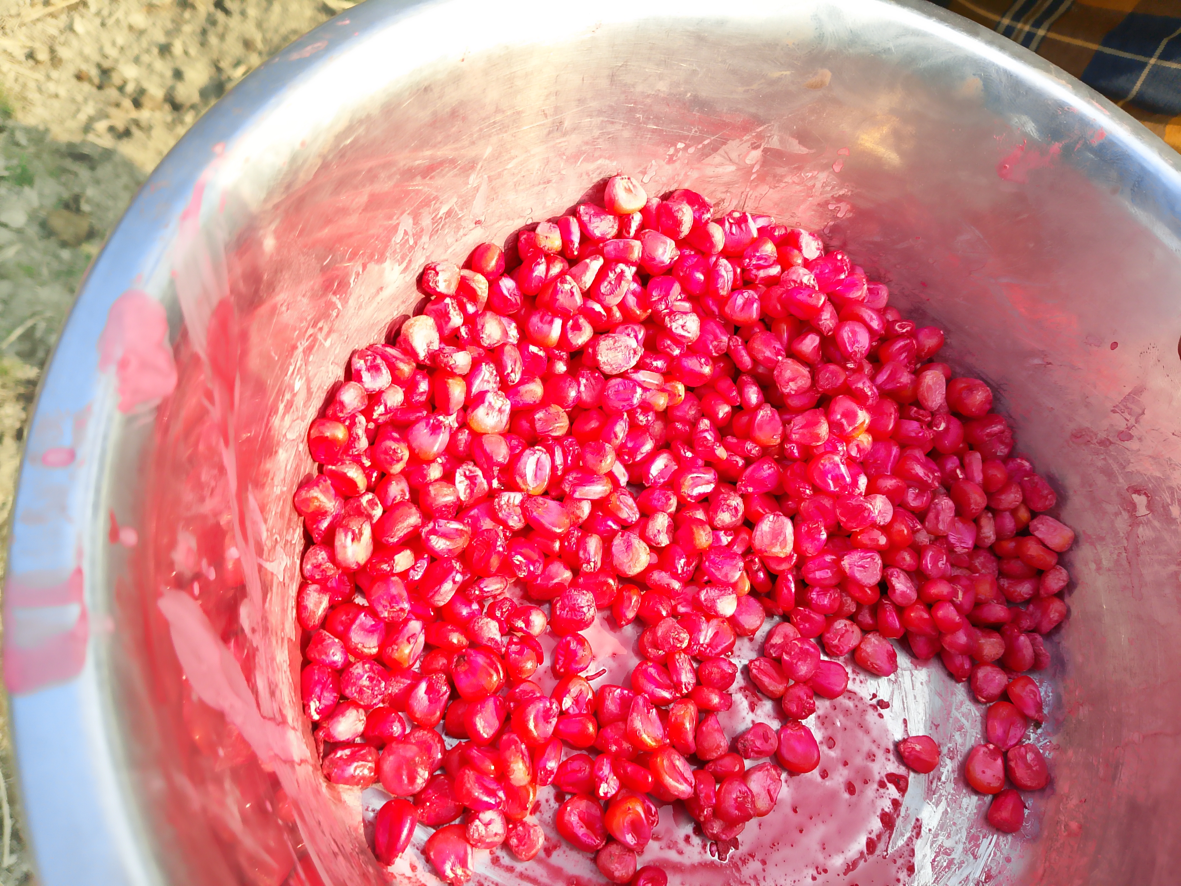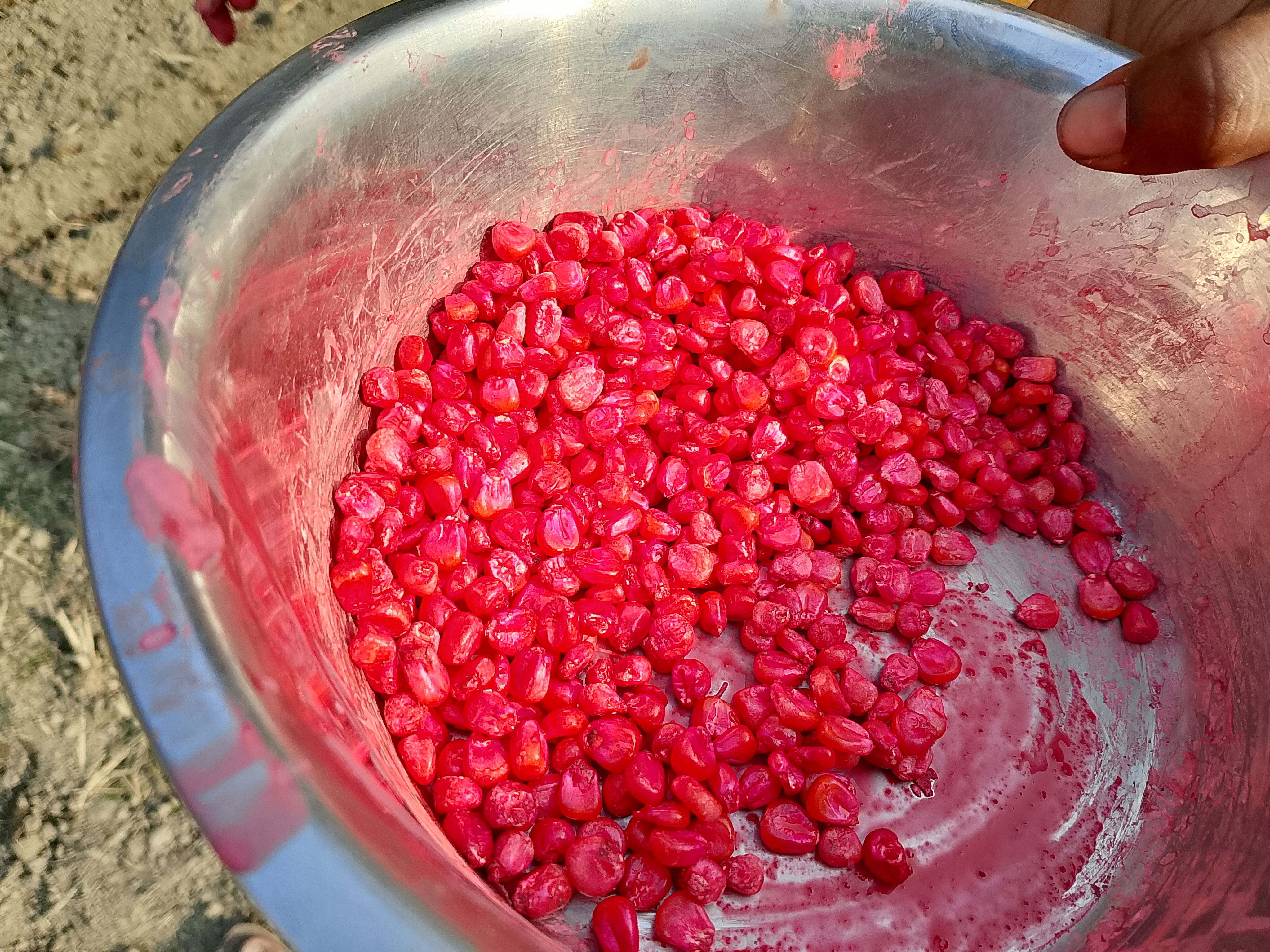 Corn seeds have been kept here, and there are many of them. They look red in color. These will be planted in the fields, and some pesticide has been mixed with them so that birds or chickens cannot eat them. After planting, soil must be placed over the seeds. Once covered with soil, they will grow well.