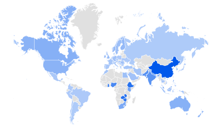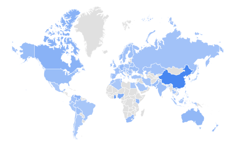 My interest in China has increased with my researchs of the topics of advanced technology. I have obtained the following map of Google trends for search statistics of the word artificial intelligence. Dark blue indicates intense volume of searches.