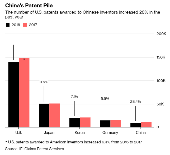 In 2017, for the first time in history China entered the world's top five in terms of the number of patents.
