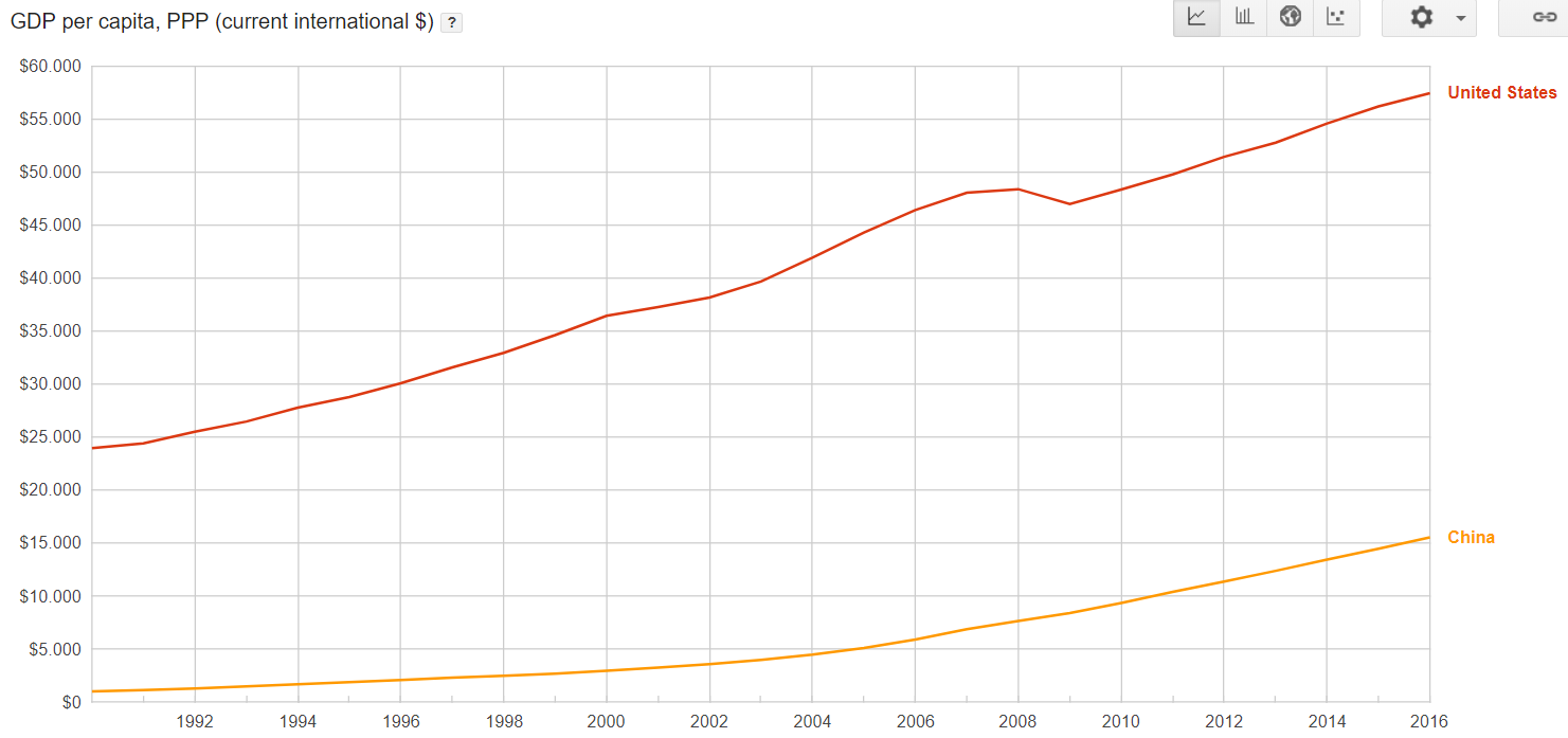 Although China has achieved an economy of up to 62% of the US in terms of total economic size, the US is at a standstill in per capita income. The development of per capita income statistics, based on purchasing power parity, is shown below.