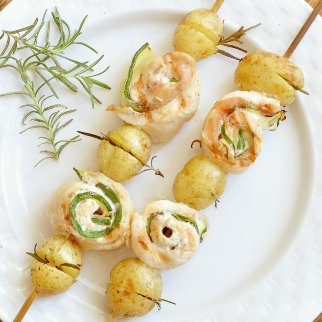 How about we commence this late spring flame broiling season with these great, delicate and delicious chicken sticks. Made with thin cuts of chicken bosom, zucchini and pancetta, layered and moved up together. Served on a stick together with delicate child potatoes, mixed with the fragile Mediterranean fragrances of rosemary and olive oil.