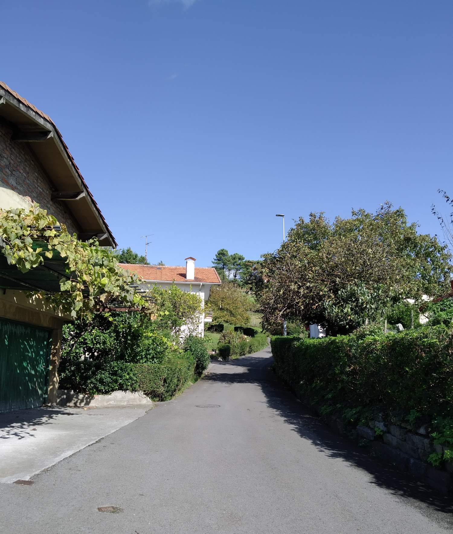 There were beautiful houses with many plants and flowers on the sides of the road.