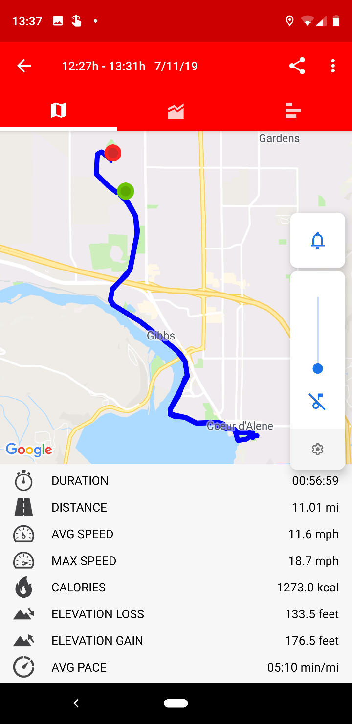 Today's Bike Ride - July 11thnoboxes (67)in #life • 7 years ago Here are the stats from today's bike ride in Coeur d'Alene, Idaho. Posted using Partiko Android #blog #nature #fitness #health #partiko