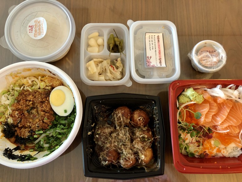 아래줄 왼쪽부터 마제소바 타코야끼 연어덮밥이에요.