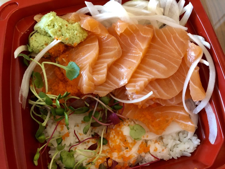 다음은 연어덮밥이에요. 일단 연어 양이 충분히 많아서 좋고요, 와사비도 아주 싼 그런 와사비 아니고 좀 좋은 와사비(다르게 어떻게 설명해야 할지 모르겠어요)에요.