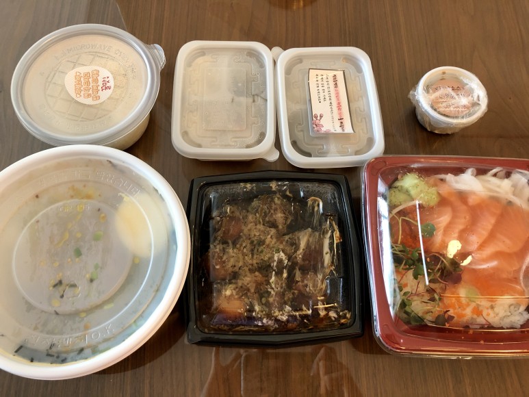 저 위의 뚜껑 열지 않은 건 흰밥이고요, 반찬이 2세트 같이 왔어요. 연어덮밥 소스가 연어그릇 위에 있고요.