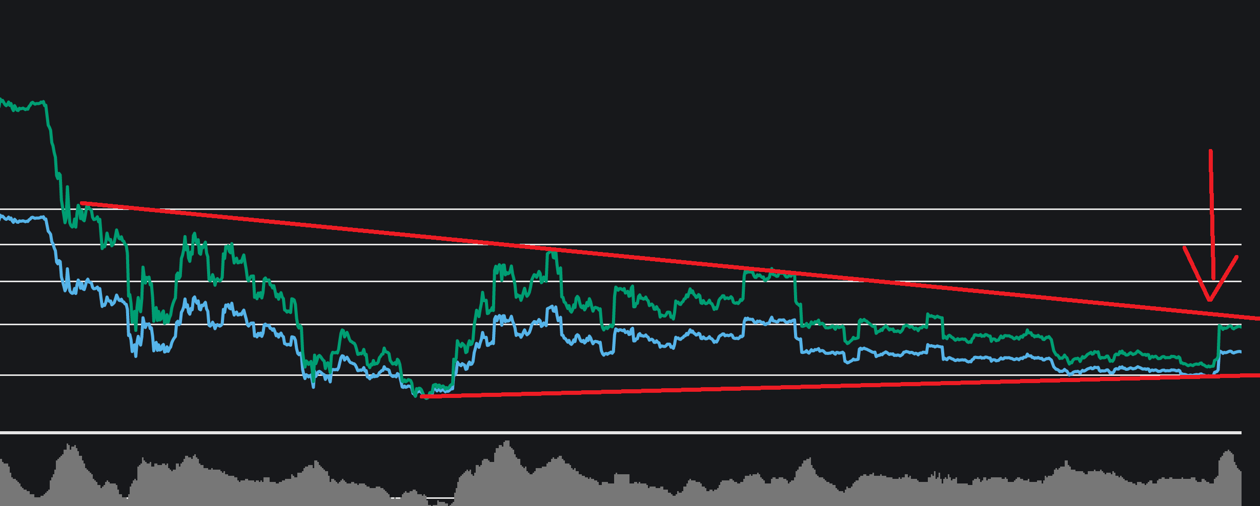 The descending triangle on bitcoin at these low lying prices still persists but not on the whole cryptocurrency market as illustraded above.
