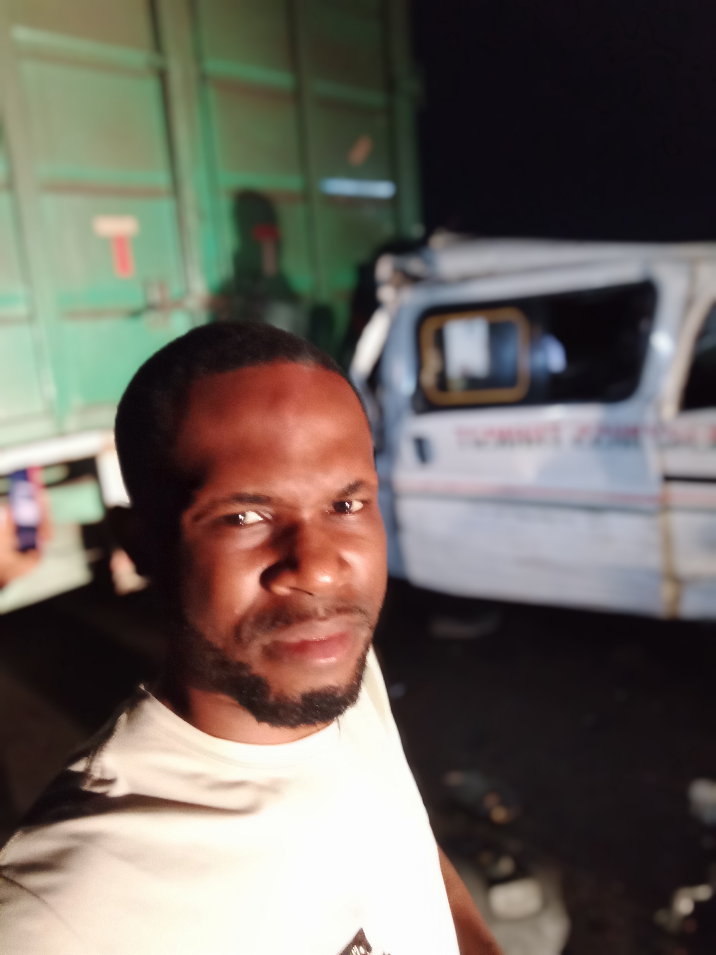 So on our way close to Osisioma flyover close to Aba main town in Abia state, I was a bit sleepy then, it was a terrible accident, seems our driver was falling asleep while om the steering and unfortunately crashed on a big Truck carrying container packed on the road side.