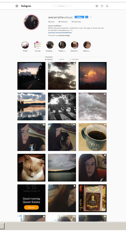 I think I said I would share my instagram link. It's @serenamatthewsmusic. No one will go investigate that unless I make it into an actual hyperlink, though. So, here you go.