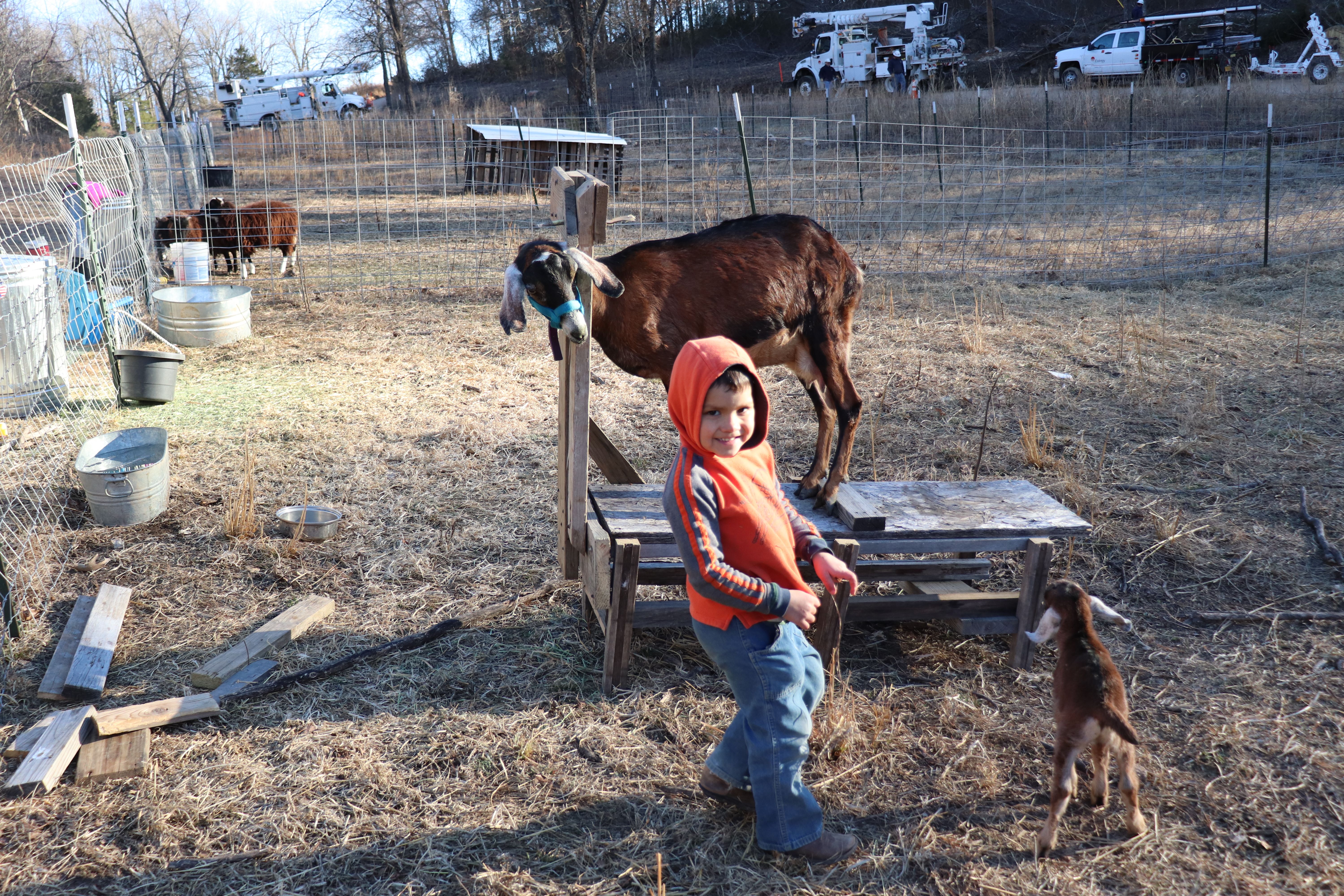 While the workers from the power company did their job, it was business as usual for us. They had their work to do and we had ours. Here you can see Monster Truck the Pepper preparing to help with a milking session of our doe Daisy. The little one named King on the ground next to him was the first goat ever born on our homestead!