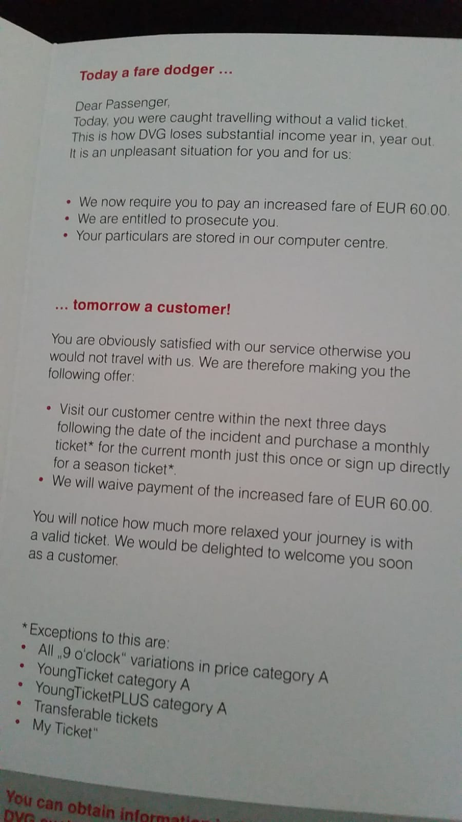 So after they have cought you fare dodging thanks to the situation they crafted and giving you the great news of you either having to pay 60 Euros and/or expect to be prosecuted, they show you how touched they are by you wanting to use their services so bad.