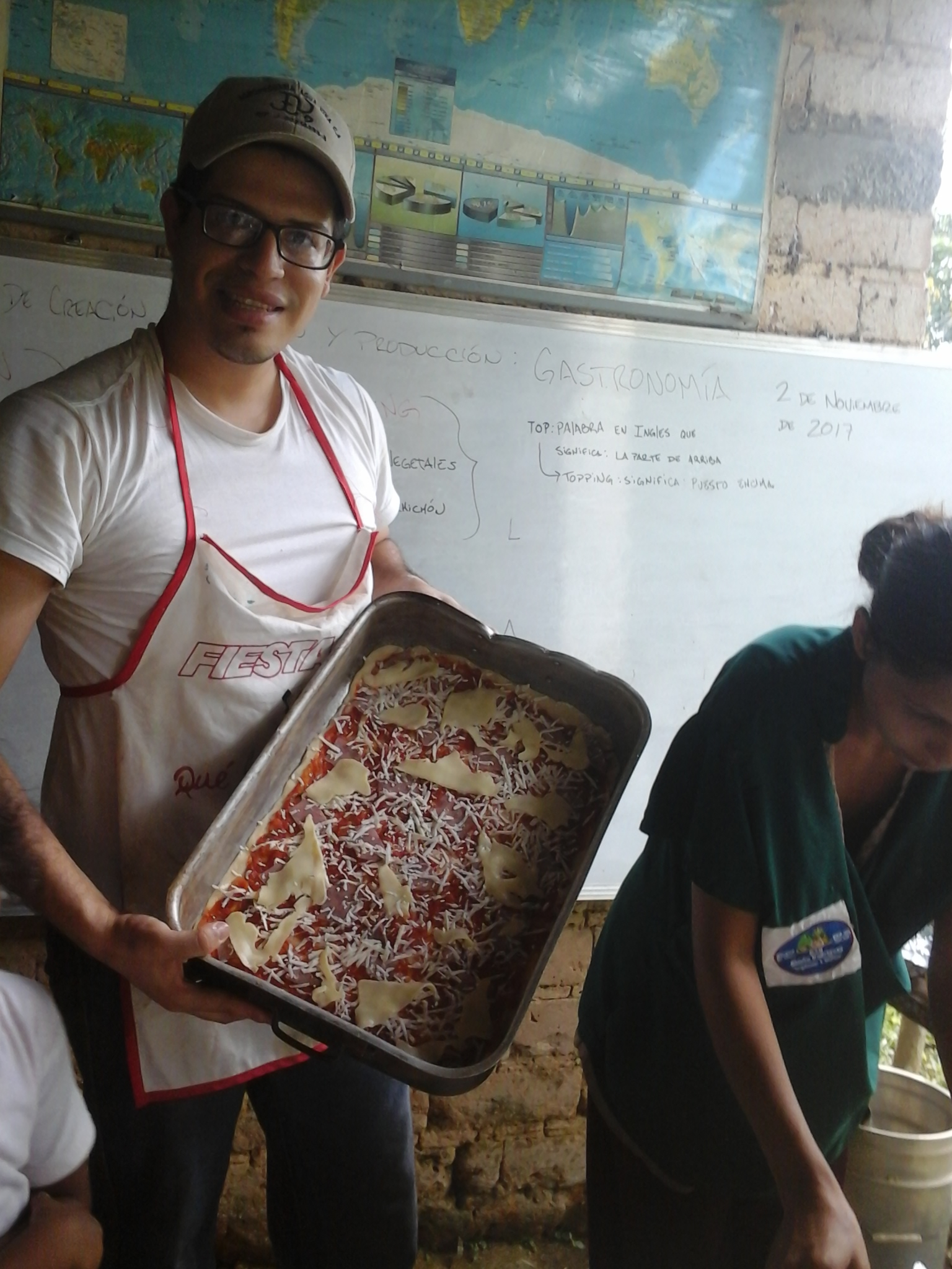 Today for the first time I'll join them in their classroom as a guest teacher, and I will teach'em how to make pizza! 😍🍕🍕they've heard about it, but they've never tried one, so they're very excited!😃❗❗... but first they show me around their beloved school, where they study and share social activities every week day. They have a lovely orchard they really want me to see, where they plant beans, pumpkins, tomatoes and cassava, and they take good care of the plants each morning. There's a kitchen full of harvested food where they prepare the daily school meal for everyone.
