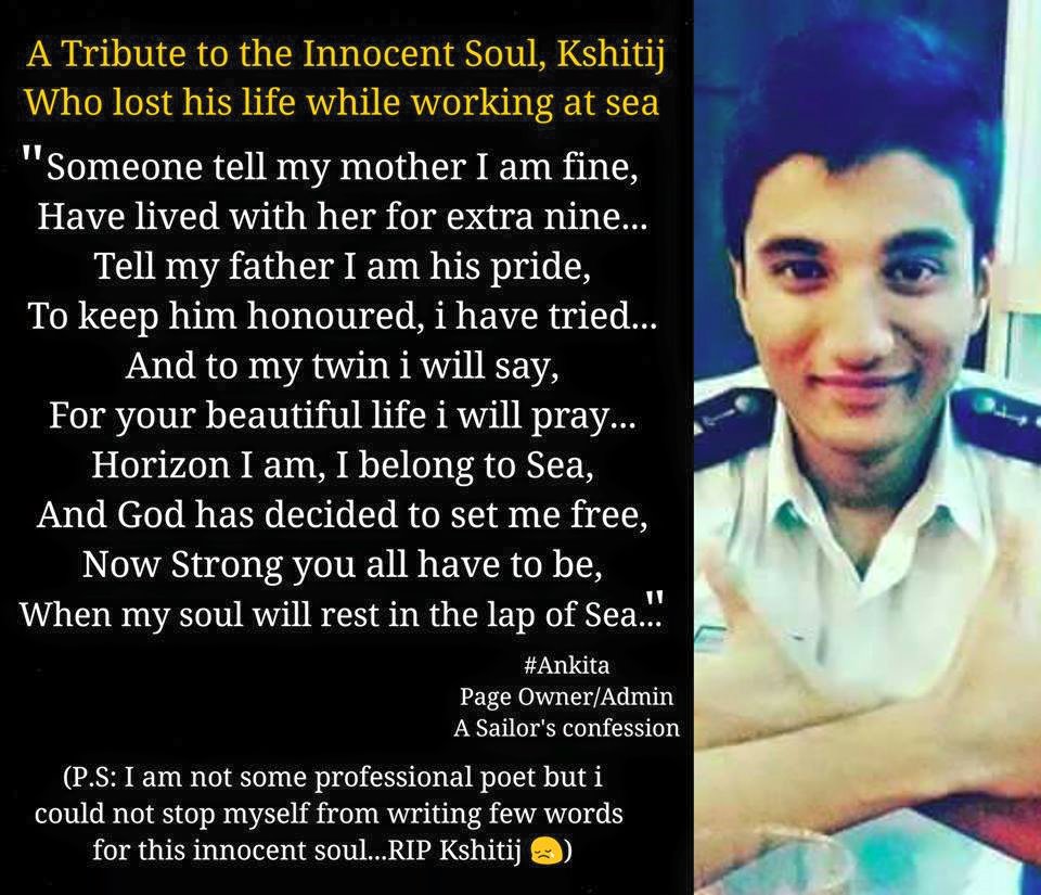 A small tribute to a brave sailor, who lost his life in the sea, winning his dream. Messages for everyone associated with this area, please be careful while working on ships, safety of life in the sea is important, you are not only taught about Solals for clearing the exams and Orols, but please do it for your professional life Also, what do you know that you can not afford to do any work that you are not familiar with. Senior citizens, please train your cadets well before giving them a new job, treat them like you always want to deal with your senior citizens and juniors, please respect your respective elders and follow them, they have And have experience. And for all those people who risk their lives when they click themselves, only for some choices you put your life in danger, this is madness, I have decided as a responsible page administrator That no volunteer will be uploaded on this page in which a sailor is endangering his life. All of us have learned a lesson from this incident and it has affected many people. It is a surprise that if this year tuning in the 'Black Year for Maritime Industry', the ship was abducted in a fire incident, pirate, a fire accident in just three months, hope that such news The sea does not come from the world. Be careful while working in the sea, the ship is the most sensitive workplace and your life counts a lot for us. Your life is very precious, God bless you all.