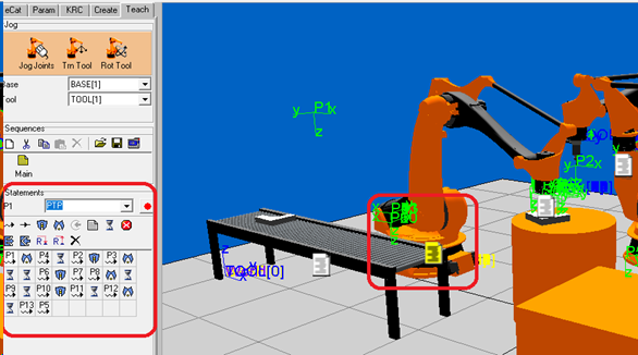 En el apartado Teach te permite programar los movimientos del proceso, el programa te da una interfaz bastante sencilla en la que las posiciones deseadas se guardan en memorias con ayuda de iconos que representan sus respectivos movimientos.