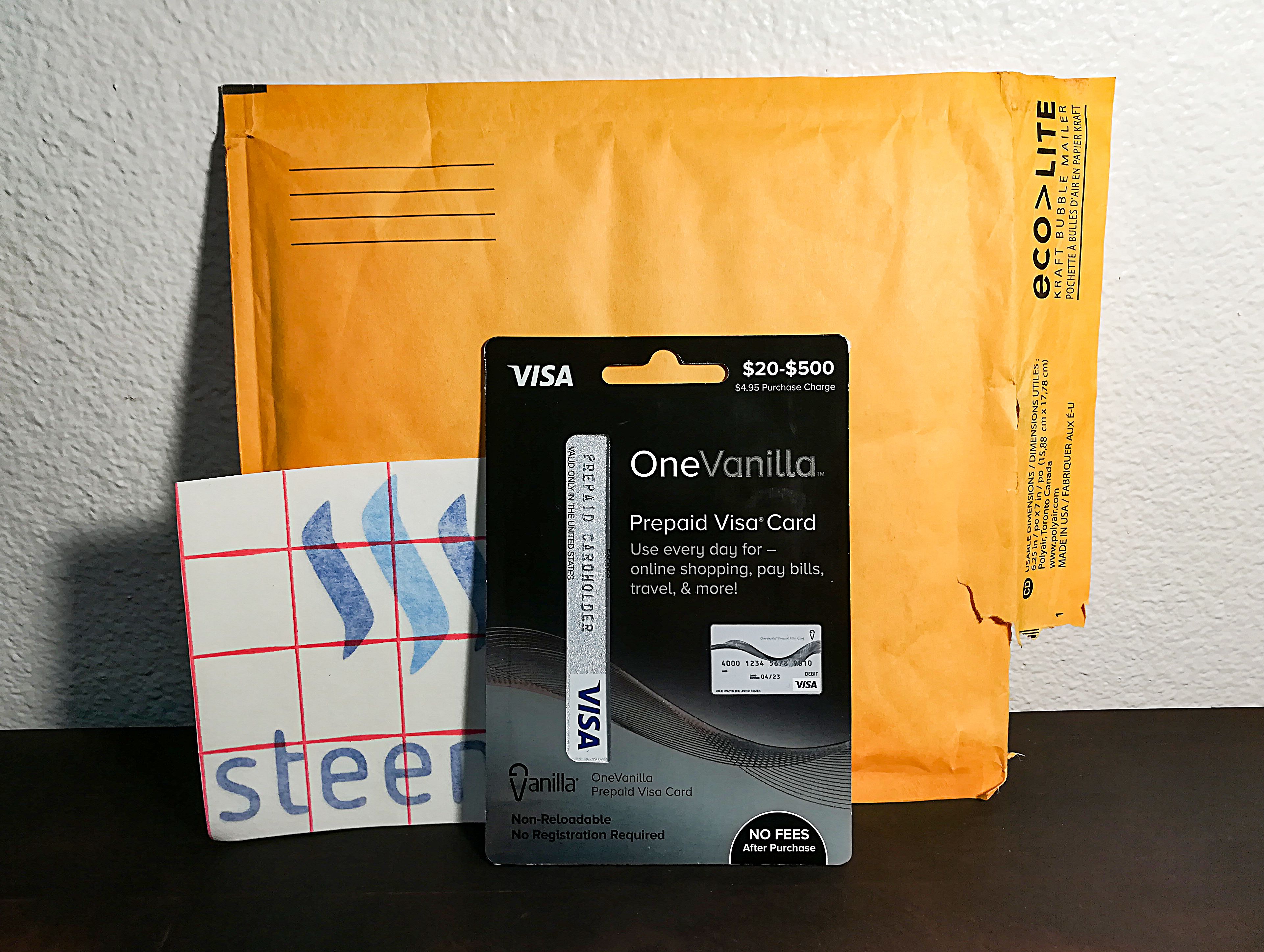 I tore into it and realized that it was the Steemit decal that I had ordered, luckily it arrived with a pre-paid visa card to help apply it Visa debit card that I had recently ordered from Steem.cards, a website created by @xtrodinarypilot that allows the purchase of many different types of gift cards with STEEM, SBD, BTC or LTC.
