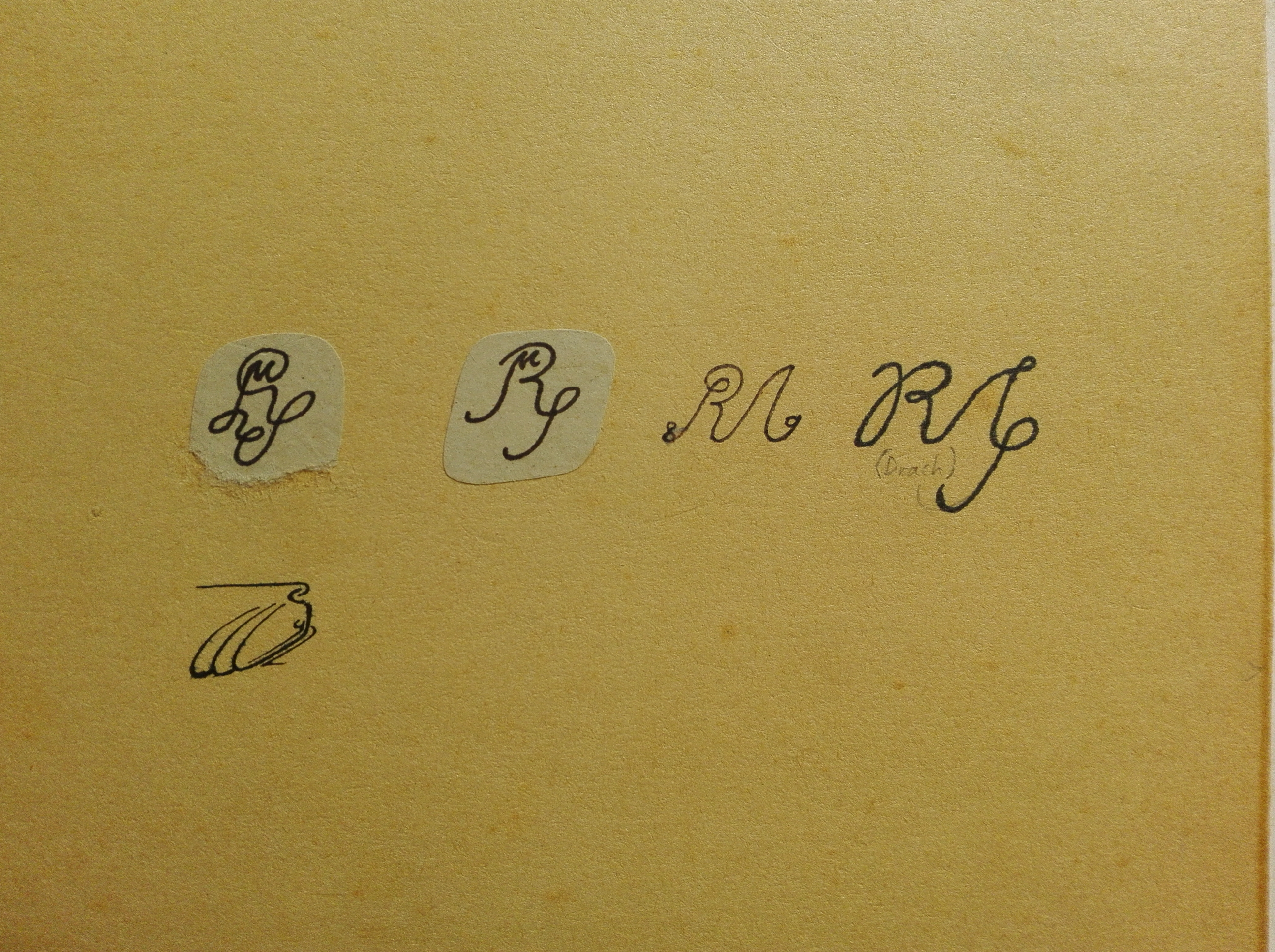 Dann kommt ein ziemlich radikaler Umbruch: das M übernimmt fast die gesamte Gestaltung der Signatur, wobei seine erste Hälfte aus S innerhalb des R besteht, dazu die letzten beiden Ziffern der Jahreszahl in An- und Ausschwung der handschriftlich gezogenen Linie. Diese Signatur ist hier mit dem Jahr 1989 eingebracht, woraus ich schließen würde, daß es sich um das Jahr der Entstehung dieser Signatur handelt. Diese Vermutung wird unterstützt von der Tatsache, daß die genannte Mappe die ersten Pausen aus meiner Lehrzeit enthält, die 1988 begann und: es ist die erste direkt auf den Karton geschriebene Signatur (die vorigen beiden sind aufgeklebte Ausschnitte von anderen Blättern), sehr wahrscheinlich zur Identifizierung der Mappe aufgebracht.