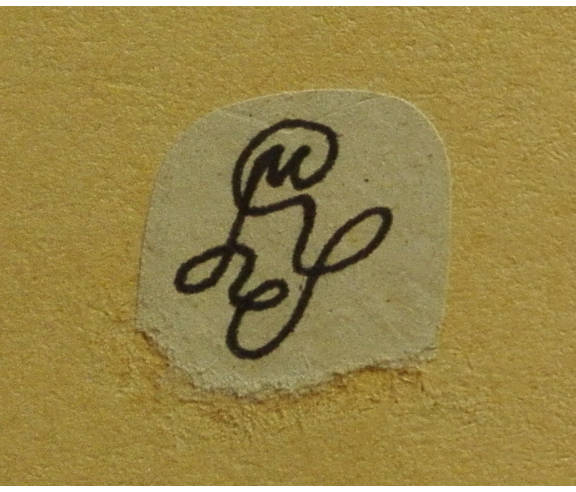 Dieses ist die "Linienversion"; auf manchen Werken erscheint eine vielleicht als "Kalligraphieversion" beschreibbare Ausführung, die der Vektorgraphik (erstes Bild im Post) nahe kommt - es ist anzunehmen, daß es sich um "Mutter und Kind" handelt. Mitunter zieht sie sich etwas in die Breite, das kommt am ehesten vor, wenn auf dem Werk viel Platz für die Signatur "übrig" ist ;-)