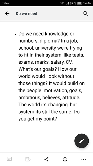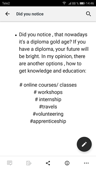 Thanks for your opinion. I'm agree that we must to have our own backbone. And what about education, its necessary.I'm just prefer for non-tradicional education ways. There are people who need only a diploma, this is why they are studying, but there are peoplefor who skills and knowledge are the most important things. I just dont like how universities dont let to be unique as we all are. And I'm not sure about studies programs quality. In nowadays we need a new age university system, this is what I'm trying to say.
