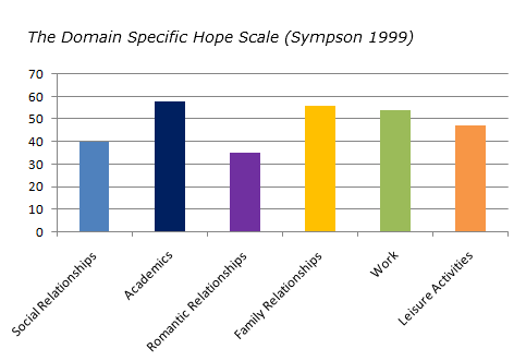 Another of these scales, the Domain Specific Hope Scale (Sympson 1999) is a questionnaire of hope based on six domains: social relationships, family, academics, work, leisure, and romantic relationships. It has eight questions in these domains, with a maximum score of 64 in each domain. Completing the questionnaire, I scored highest as hopeful in academics and least hopeful in romantic relationships, but again it was difficult to find a comparison group to reference my results with. My total score was 290, with an average among undergraduate students being 302 (3). My results are displayed below: