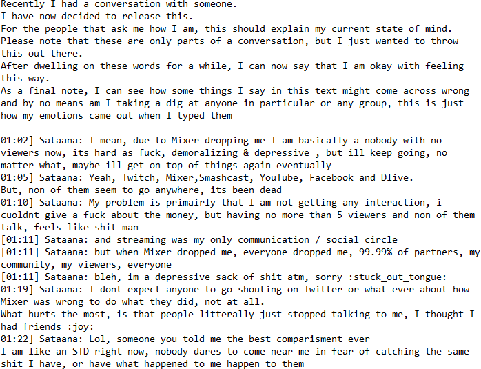 Streaming has been my way of communication and interaction with the outside world ever since, I have no "IRL" friendships as I live abroad from my family and home country, and have not managed to tried to make any friends here, which at this point seems impossible due to my mental and now physical disabilities.